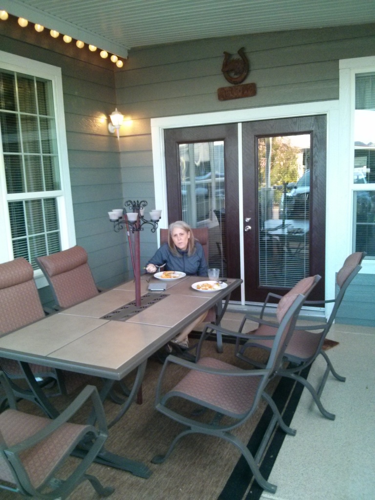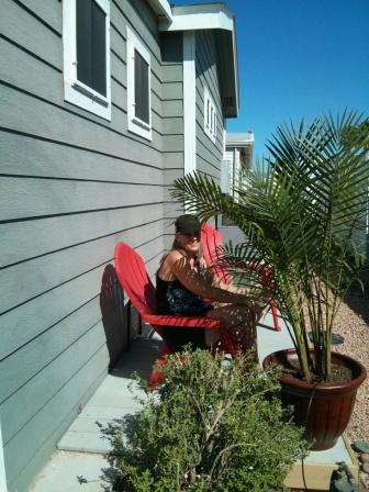 March 15 Another 80 degree day !! . Going to Lowe’s again. Shopping at Target for runners to hike with and to run in the gym with. Plans are to go to the top of the Superstition Mountains. Doing the odd thing around the house, visiting neighbors and expect friends from Edmonton to arrive today. We have the wine and beer chilled ready for them. Enjoyed a beer on the next door neighbors pad.Jackie is sun tanning again on her new small rear deck with her morning tea. I have to build a retainer wall along the side of our house later this week. Time really does fly by but am enjoying every moment of it. A short gym workout and then to the pool tonight. Fred & Terry have arrived and we will be having a $5.00 burger and pitcher of beer with them tomorrow night at Fat Willy’s.They will love the heat on the patio. Here is Jackie sweating in the 82 degree weather on the small back deck and enjoying her time on the side deck in the cooler evening.