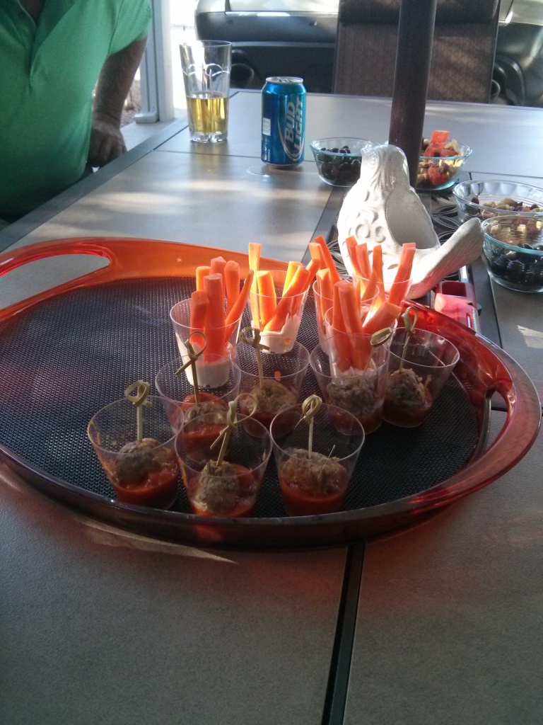 neatest hors d’oeuvres I have ever seen. This idea is brilliant. Warmed spaghetti sauce with a meatball and carrot sticks with ranch in shot glasses. Awesome idea. Tasty and great looking.