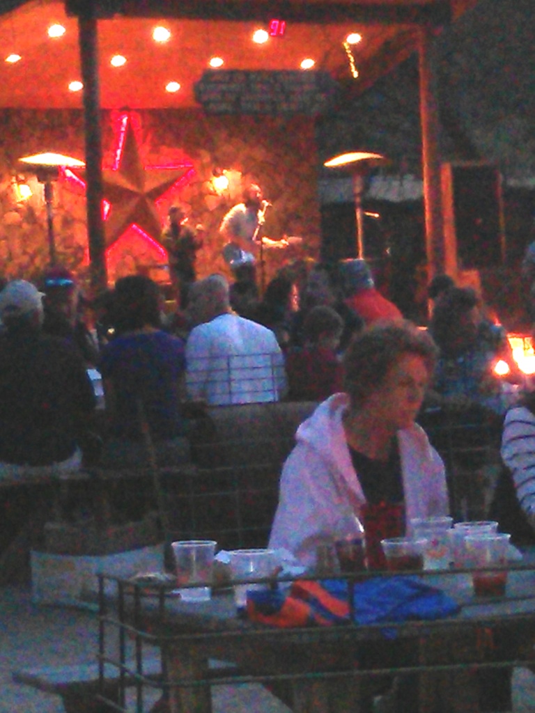 dirt floor, picnic table , firepits , music stage and amazing food. It was a warm night to sit outside. Mom had a white vest on which was scary with the picnic tables, smoke, and the amount of BBQ sauce on the ribs.