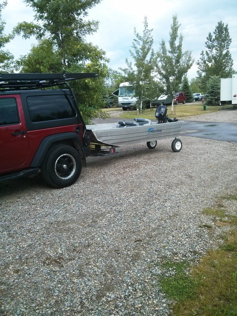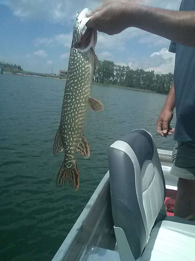 we discovered a great method of moving the boat by using the jeep and pulling it. Worked great ! The winds were so strong we could feel the motorhome moving from the gusts. Great day of fishing though ! Over the weekend Larry kept cutting himself. Loading the boat , cut, unloading the boat , cut. I am sure he has a least 3-4 bandages on himself. Cleared up a bit later, sat around the fire, walked and had a fun evening. Next day the fishing was a little slower with us only getting one but it still was fun. Again a storm was brewing so we fished nearer our unloading spot just in case and again rather than get wet choose to exit the lake. A few drinks, supper and sitting around the campfire. It was CFL Edm/Sask in FT Mac Night.