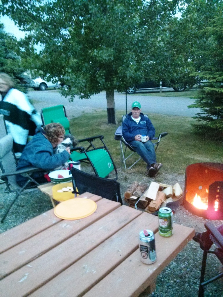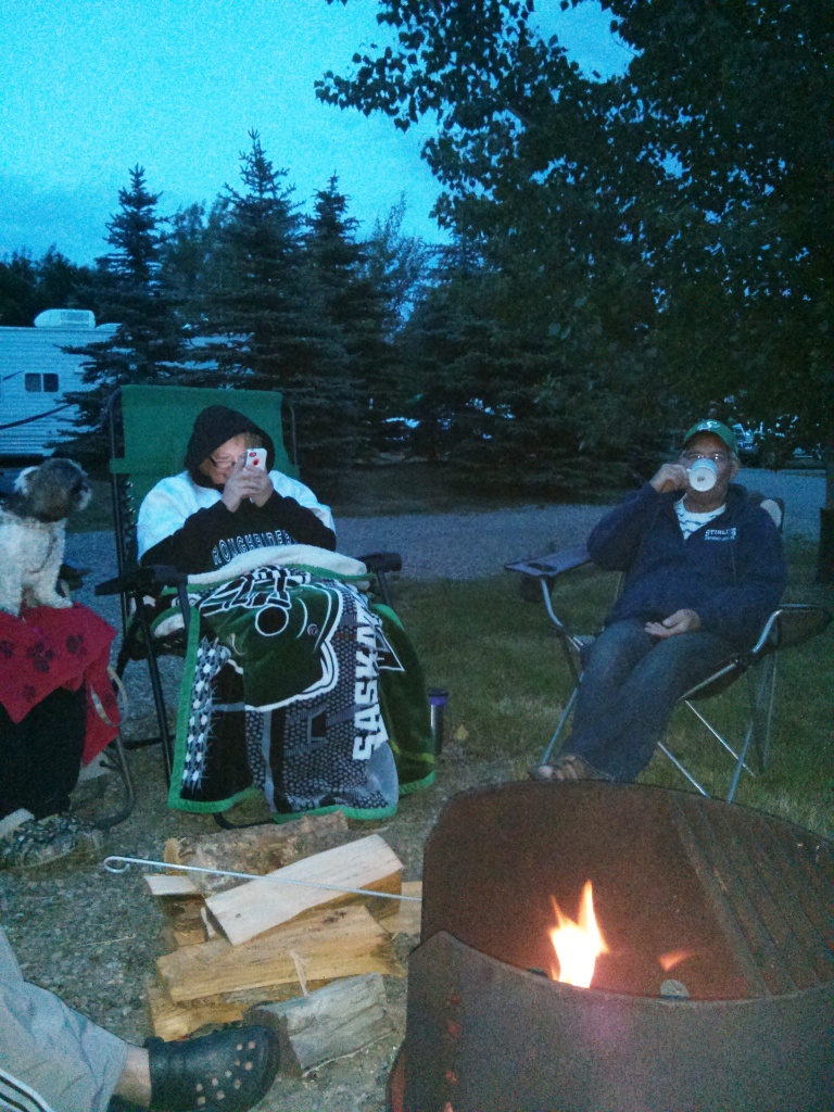 Sharon is a die hard fan. The MacDonalds have everything green and logo’d. Mats, cups, bowls, shirts, hats, sweaters etc. And this is not even dressed up for the game. Funny as between smore making and talking Sharon would check on line the live score and cheer, use her bom-boms and cheering toy football. It was funny to see Sask lose after all of that. But they took it as a fun event and the outcome doesn’t matter. I don’t think so . LOL During all of discussions some interesting comments and actions came up. Larry is getting old age barnacles on head, Sharon in her new Mazda