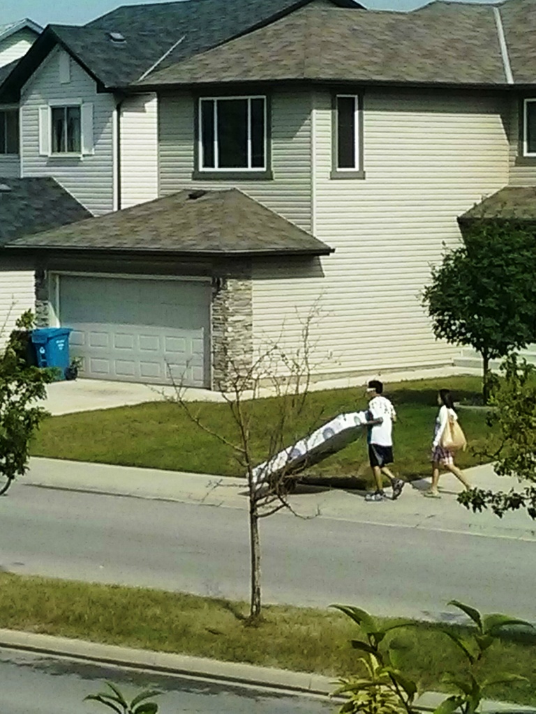 Ten minutes later here comes the same couple pushing the top mattress. Awesome. Young love . I wish I would have though if this when I was young.