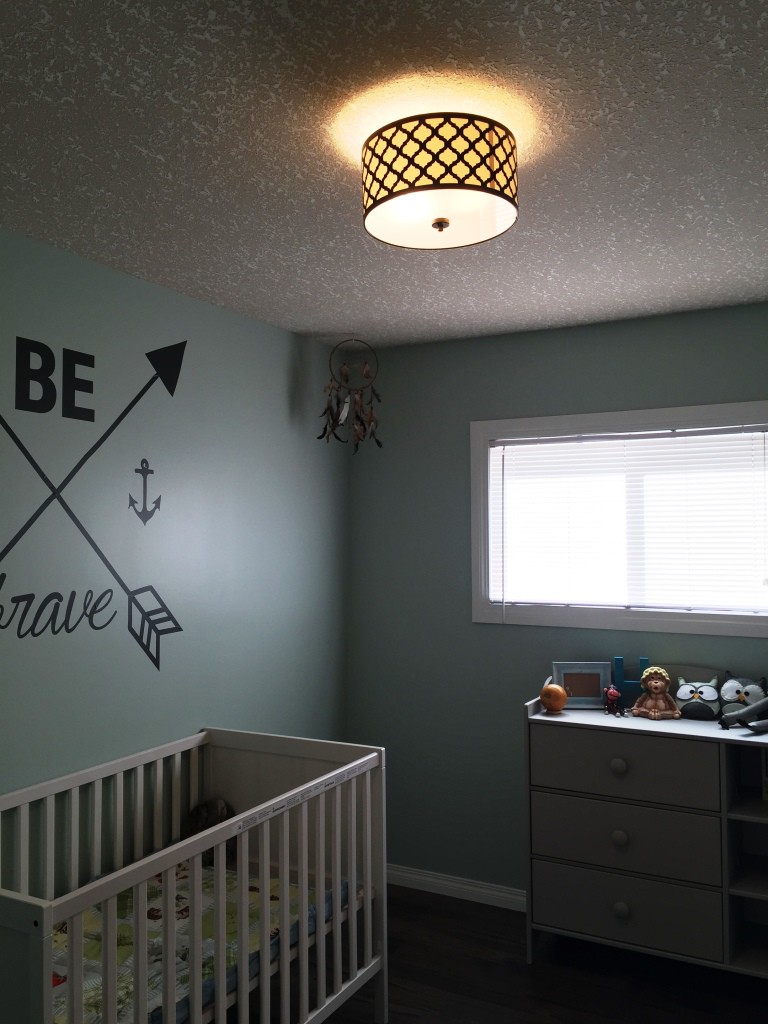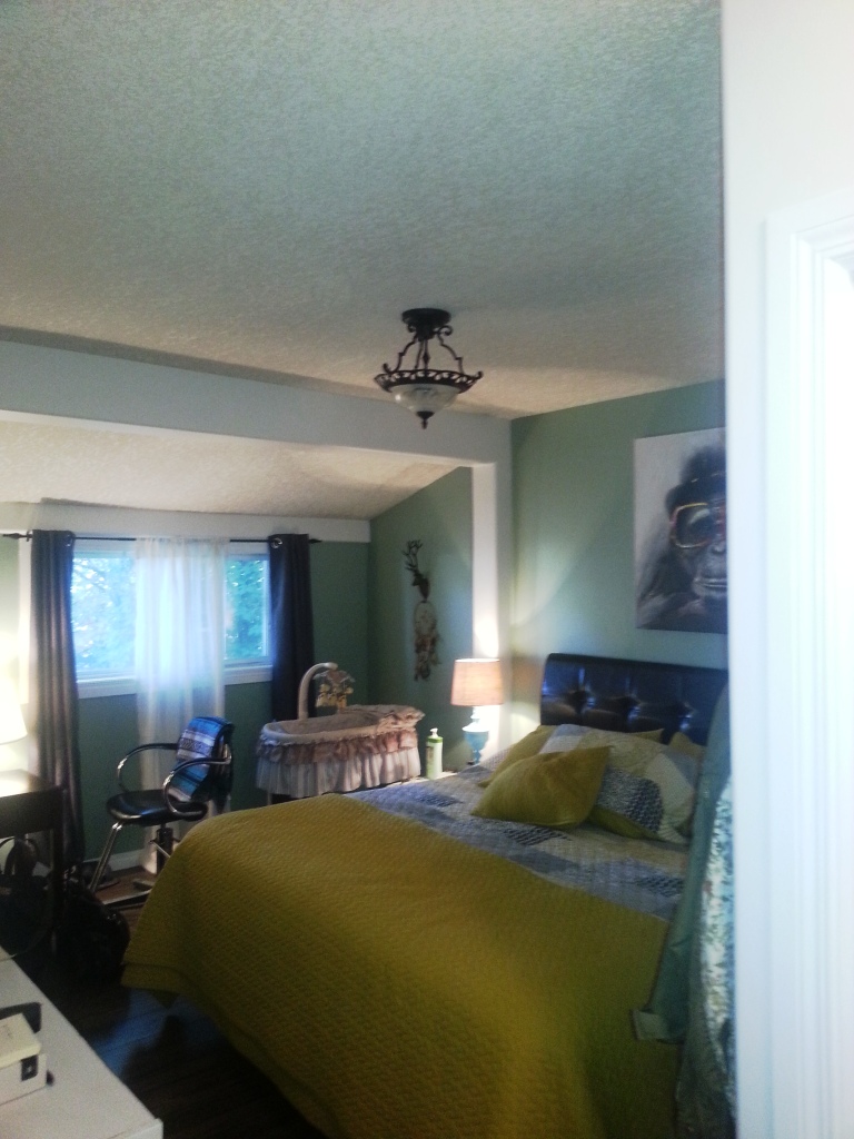the Depot. The third door only took about 1/2 hours to do. Next job was to install a new light fixture in the master bedroom. While Corey and I were doing all this Jackie and the girls were hanging pictures and a neat deer head picture frame and dream catcher. We then tether strapped both dresser and change table to the walls.