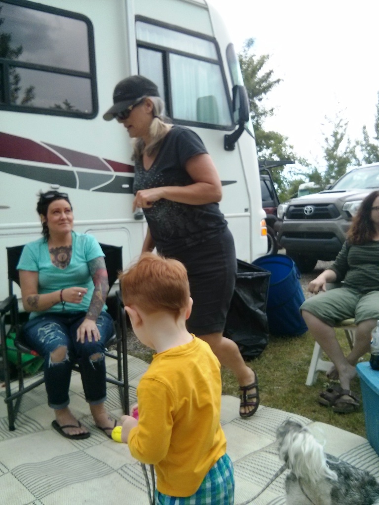 has killed a bunny, skunk and a bird causing damage to her vehicle, and Rob while backing in his campsite just touched the water tap and broke it off causing water to come spewing out for a long time until they could turn off the water and he threw out one only shoe that was Sharon’s favorite. We had smoked home made jerky that Larry made with his new smoker which was awesome. We also had company on Saturday with Jessica, Penny and Margy with