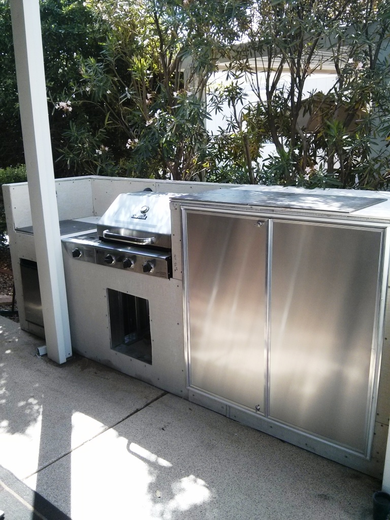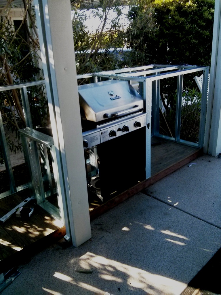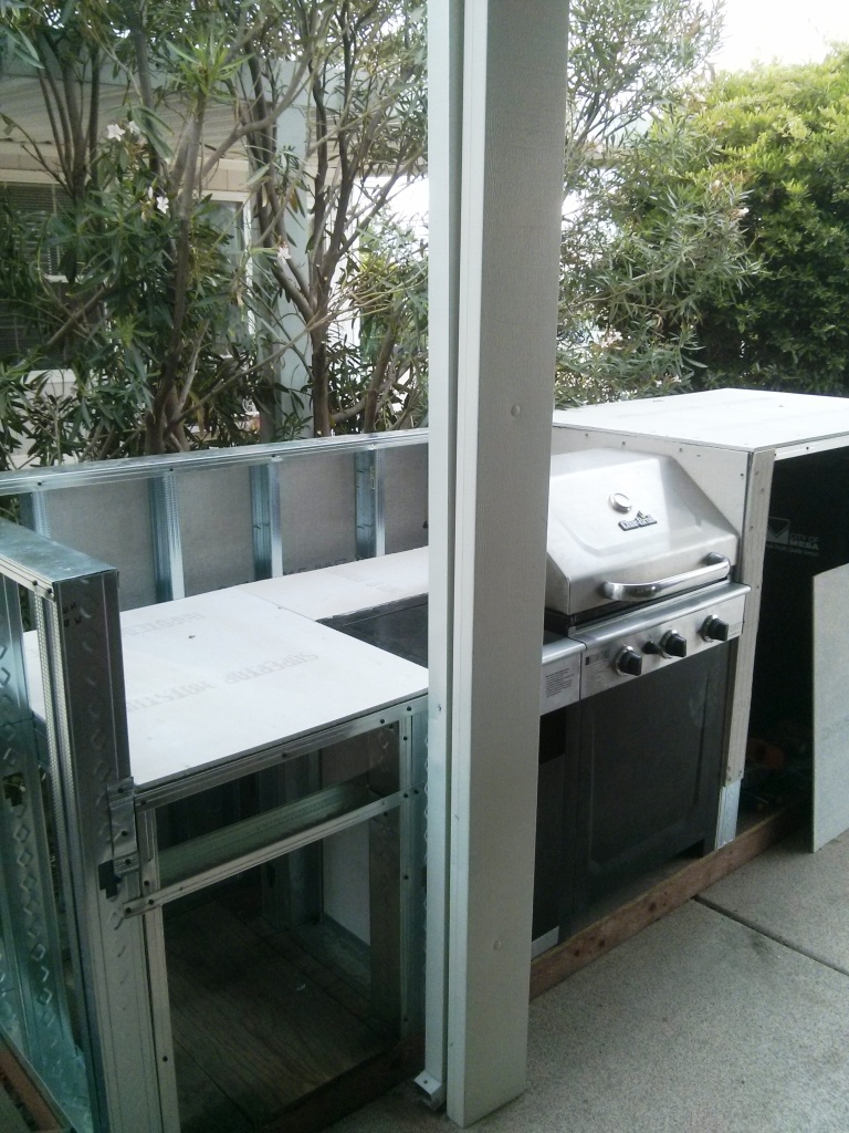 Now onto my next project the outside BBQ kitchen that will have the BBQ a fridge counter and a large door access for our garbage and recycle bins. It will be done with slate looking porcelain tiles and an acrylic stucco exterior. I am looking at a 32″wide by 108″long by 48″ high backsplash unit.After a lot of research I am going to make it completely with steel studs. Just need to find the right kind as Home Depot only has the non structural 25 gauge and I need the 20 gauge ones. I will find them. This is a labor intensive job that will take quite a few days to complete. But I have no timeline to schedule when to finish or start. I have been researching the construction and accessories so when that is done the work may begin.I will use painted access doors as the Stainless ones are a way to much.I am positive it will look great.