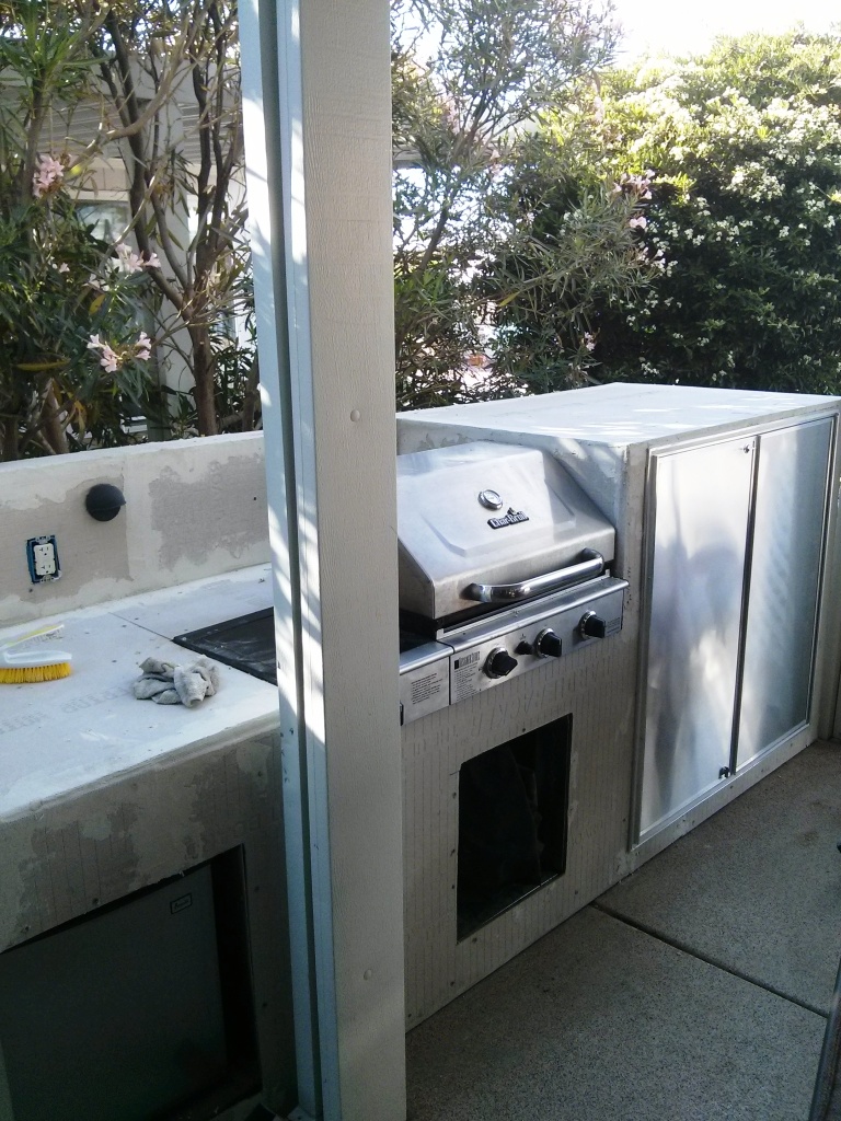 fitting to make sure everything is going to work ( internet sizing on the fridge though) Placed the BBQ and discovered a mistake. I measured and re measured but the lid of the BBQ is outside of the base and puts me out a 1/4″ so I can’t fit tiles between the BBQ and wall. Two choices, I can remove one side of cement board and more it over and put the board on the fridge side or try to use a sheet of aluminum to deflect the heat. I will figure out that tomorrow but leaning towards the taking the sheet out. Cut the vent hole with the angle grinder which worked well. Used up the wheel real fast. Went over to Fred’s to find the tool to remove the wheel and talked and had a beer with his brother Tim. Funny thing Tim removed the wheel with hands. ( still need the tool to tighten) But funny. He is here for Nascar. Whipped to Harbour Freight and picked up some wheels. Great place. I bought a pair of special vise grips for steel studs for $4.99. Amazing. I have most of the sheets cut except for the backslash which I will do first thing. It is a little difficult making sure Jackie isn’t on the phone when I start up the machinery. Electrical work comes tomorrow. I think I will keep it simple with a switch, a plug and one light receptacle for low voltage lights. I will use these as hi- light lites. Hardest part is making sure the boxes are water tight and making it work with steel studs.