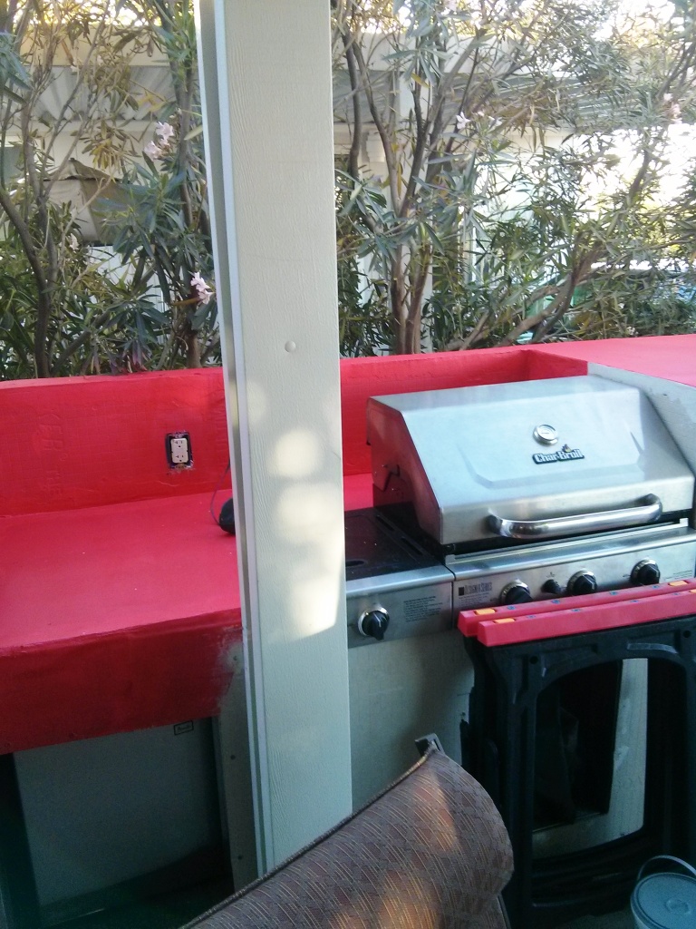 Started working again on the kitchen. Bought the Redgard and fiberglass mesh and started using the thinset with the mesh to cover all of the seams.My idea is with the mesh, thinset ( basically a mortar with adhesive properties and being somewhat flexible with polymer added) and the flexible waterproofing of Red Gard I should have a water tight structure ( except around the BBQ opening and fridge) with no cracking grout or tiles. Took all day doing this but it is done and looks good. Tomorrow the Redgard stuff. I also lined up a golf game for Sunday which will be nice. Just another beautiful day today not to hot or cool. Around 82 or so. I had to take another picture of