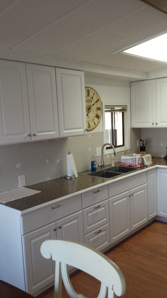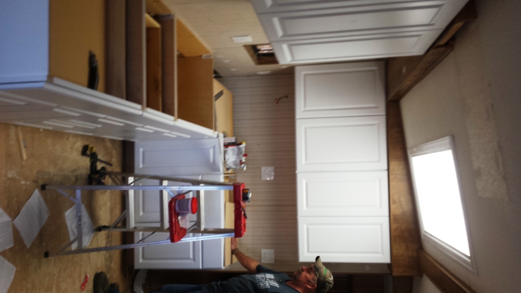Another full day. Finished off the bulk heads which was the most difficult thing today to do. Just need a bit of trim mold on the right side. Left side just needs primed. Finished off the molding in the bedroom and bathroom. Finished off the end butt board next to the stove. Then off to start on the cabinet pulls and handles. Getting these even is always difficult but my template worked again quite well. While all of this was going on we were interrupted twice. Once for being young and with a truck we were asked to help move a refrigerator from one home to another. We even had to move it to the backyard. I am sure the sellers of the fridge had a bit of “old age disease” as they were a little confused and anxious over this. Good deed done. Then we had to cut a puzzle board out for a neighbor. All good and another good day with the end getting closer other than prime and paint and backsplash. Fred made us a great supper and we watched a few episodes of Arrow which is a great show to watch.