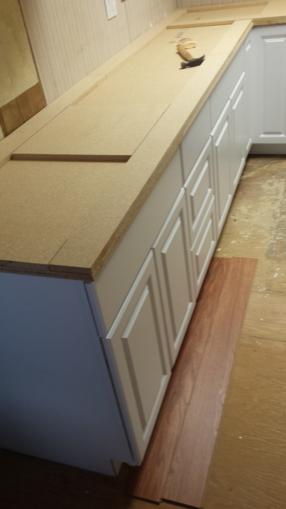 Another long day but very productive. Started at 9 am today and worked until about 7 pm. Completed the production of the counter top with the screwing and gluing done. Laid the laminate top and the edge on the small insert piece. Plumbing all done under the counter and finished the install of the sink and tap. It was a good day with a lot done and very few issues which was nice. It is starting to look great. After tomorrow it should like a new home with the flooring complete, re install the base and start on finishing the bulk heads and end section of the cupboards. Busy busy day and a very early start tomorrow coming up.