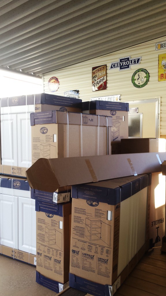 door. Finally after cutting the spindle down a bit and adding a lube spray the lock is working correct. There must be two different widths of patio doors. Ran Tim’s water also to make it smell better. Back to Fred’s place to get the flooring that was glued down off which took quite a while. Ran to Home Depot and picked up and unloaded two full pallets of cabinets for the kitchen. Enough work for today. Treat now is Fat Willys for a beer and food. Tomorrow will come soon enough and the install begins. Tonight is Fish Friday at Fat Willy’s and we had a new waitress that was excellent. She really took care of us making sure we had a great experience. She