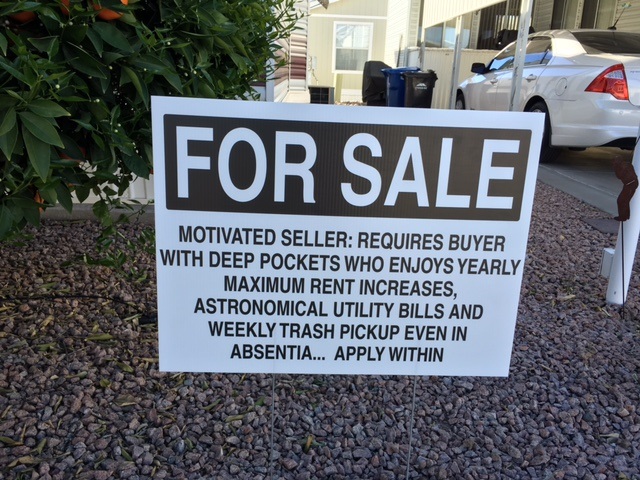 4. Weekly trash pickup even with absent– this one drives me nuts. At home doesn’t he think he pays trash and sewer etc for 12 months. The City of Mesa used to allow a furlow each year when you leave and just charge a disconnect and re connect when you came back.  That was nice but think about it. Just because your gone there still maybe 40 people on your street so the garbage truck still has to drive the same amount of miles.  This issue when they changed it caused a huge ruckus. City of Mesa not the park changed. Think about it.