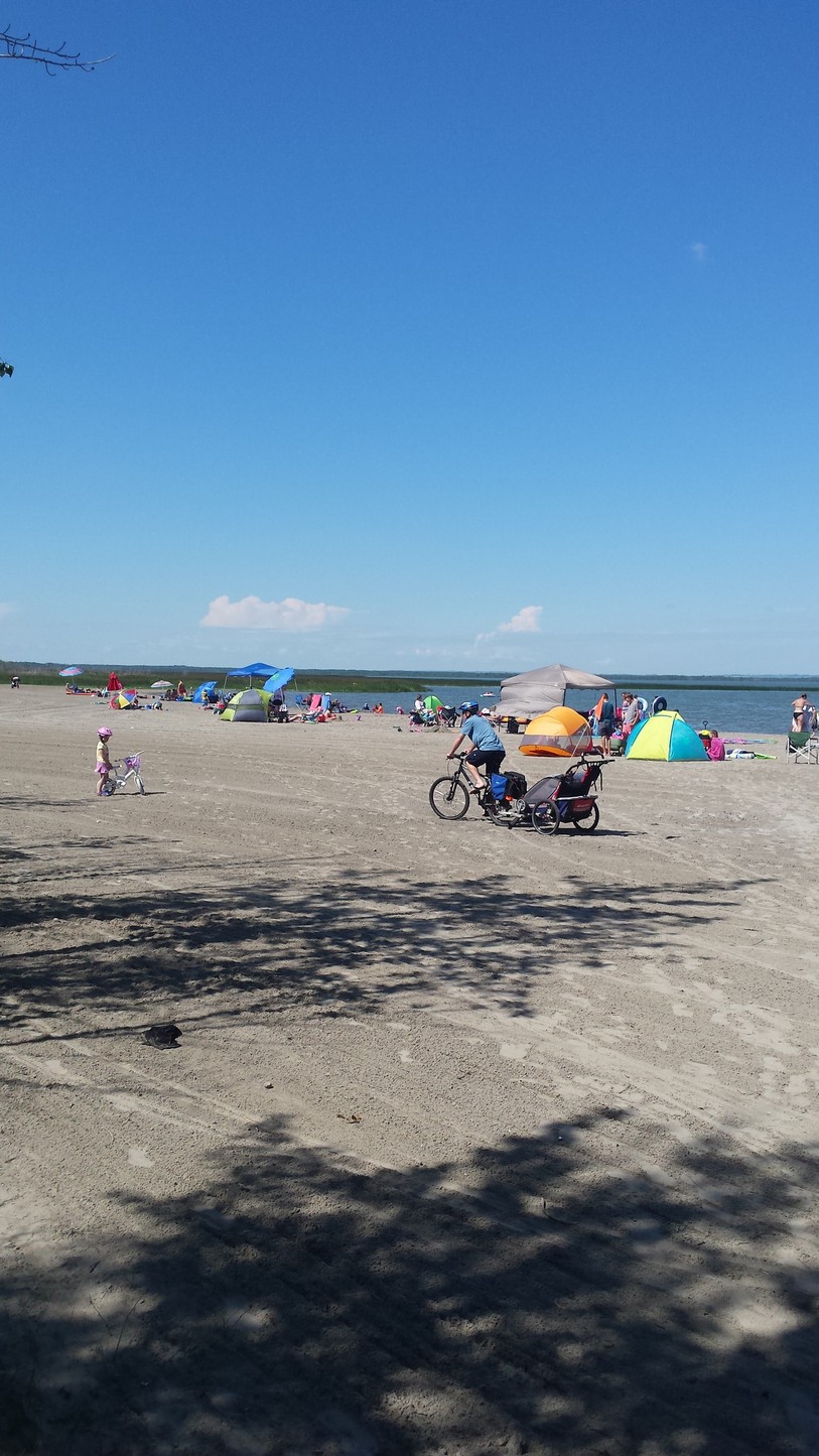 people. As I said the beach is incredible. Real sand and lots of it. They rack the sand every night and the morning beach looks great. Jackson definitely is different than our two girls as he does require constant attention. Our girls used to spend hours coloring and playing games. We walked all over the park, and rode our bikes twice around the park. In our own loop Jackson made numerous trips around the sites. I guess due to the sleep he doesn’t tire easily. It was a fun day but a little tiring not our usual relaxing camping time. LOL. We will see how the night goes. We had to say tomorrow for a lot of things so it will be busy. Great our weather is so good. I would rate today’s weather as HOT.