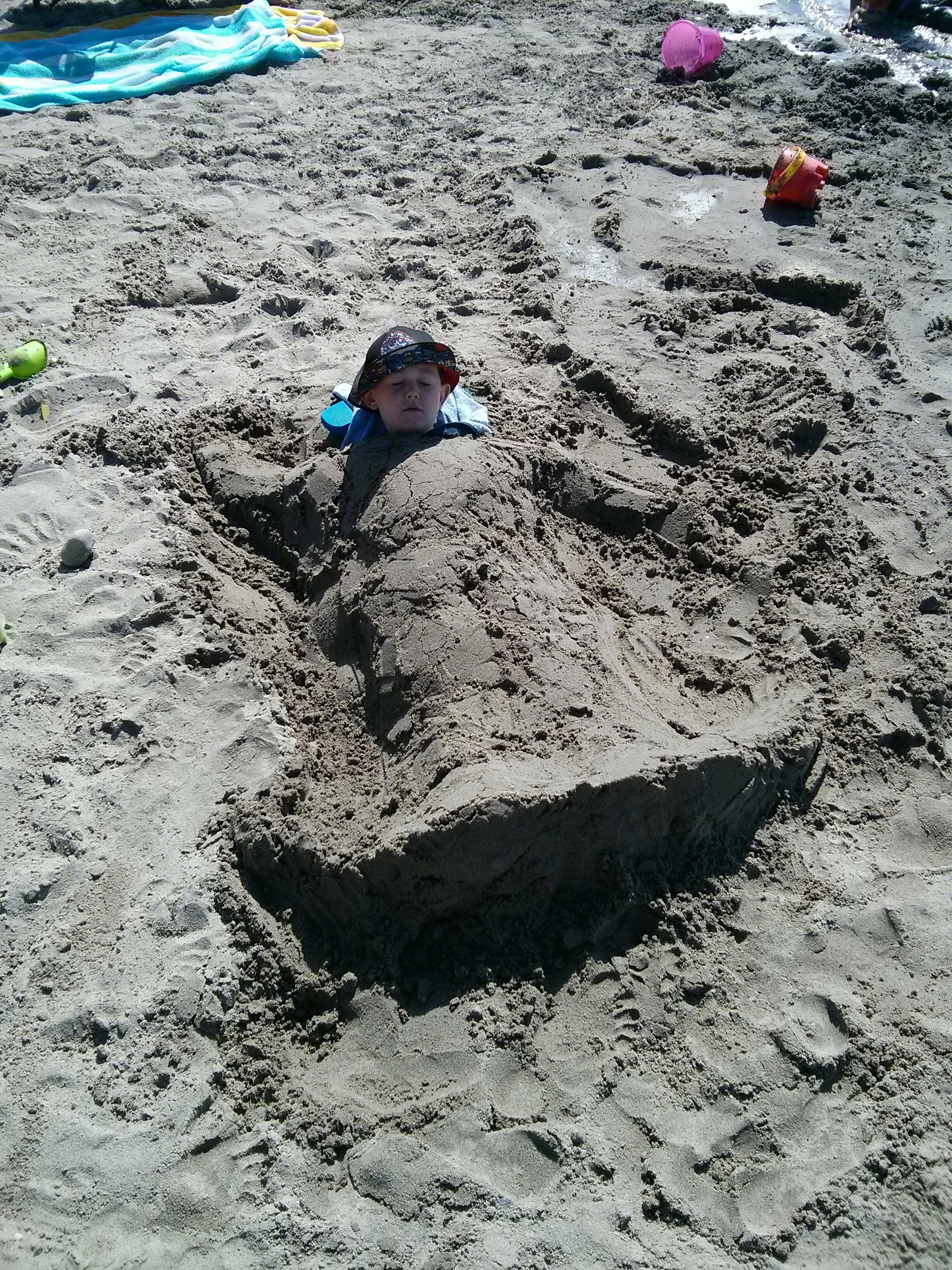 Another sunny and hot day. We picked the perfect week thats for sure. More beach time. Playing on the air mattress, building sand castles and burying Jackson in the sand. The amount of young families is amazing. I am also impressed with the amount of for people. We sure aren’t American. They have trouble when everyone goes to the beach the water level raises so high it runs off into the river. We played at the beach for a long time, took many bike rides, had a game of mini golf, played on the arcades DEER HUNTER and race cars and walked around the park. For supper we had my home made potato salad with chicken breasts which were fantastic.