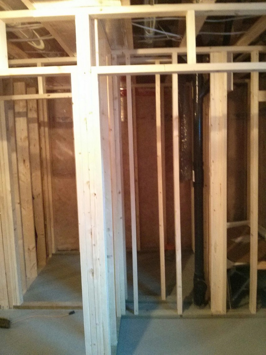 square that I couldn’t find in the garage anywhere. Having said that it is always difficult to make everything square in a basement. The builder walls were out over a 1 inch out from end to end and even the floor joists were out when I was using them as a reference. This is from so called professional’s . Out by that much means they had to cheat the plywood or framing to make everything work. I remember in the 70’s when I first started as a professional sales rep on the road. If I came home with no orders for the day I was quite upset. I was paid to sell and expected everyday to be a good one. These guys make a house out of square and they go home and think nothing of it. I am happy with everything completed in the basement except one bathroom wall which I am still going to change. This is a wall around the stack that I have changed 4 times and must do once more as when I was leaving it still did not meet me eye. It is out. I will fix as I haven’t used the ramset on the bathroom walls as of yet and the bath walls I screwed rather than power nailed them so I could adjust them. The bathtub wall requires only a 1/8 clearance so you need to be quite precise.