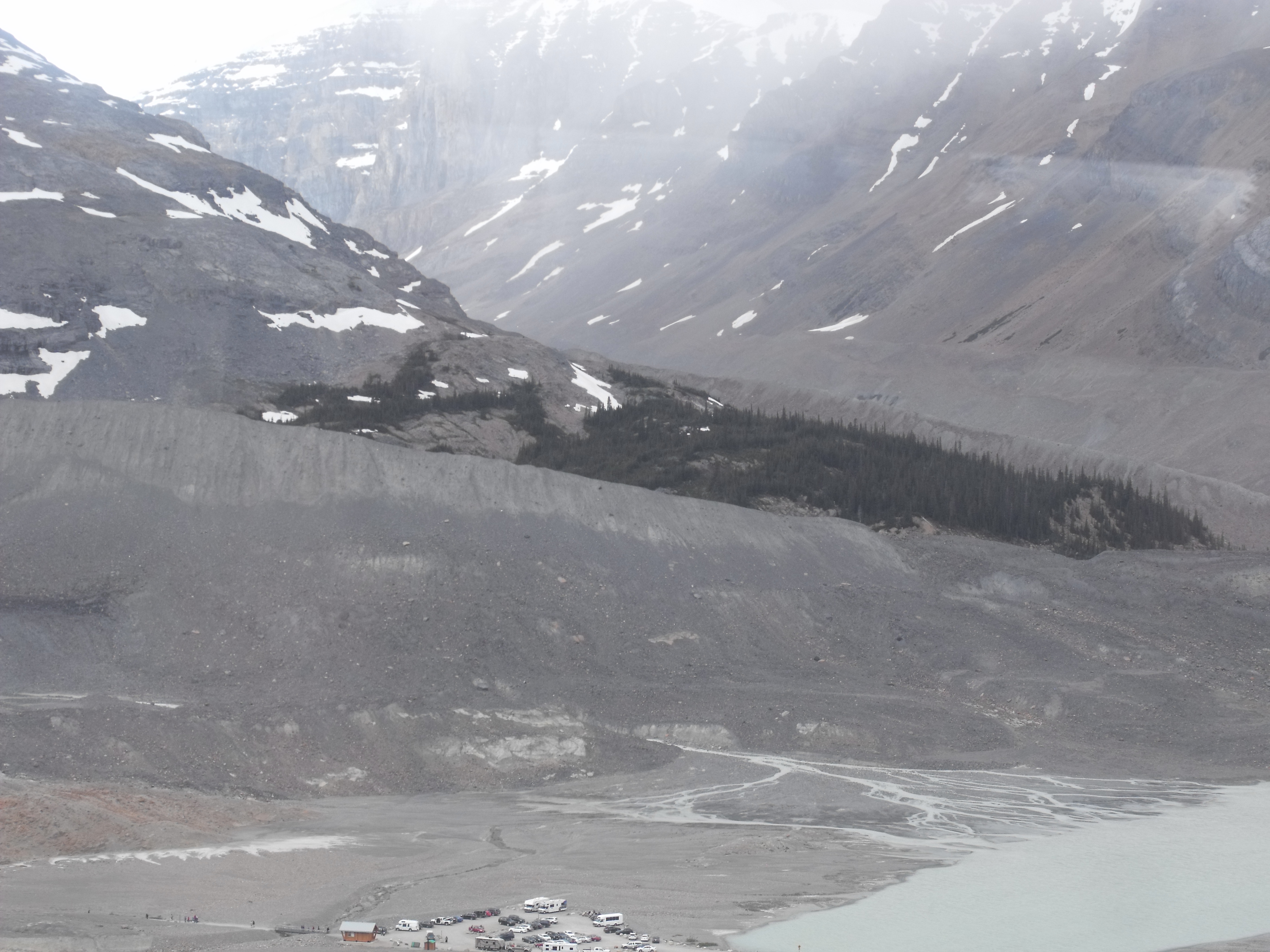 Slept like a log last night not waking up until 9 am. The cold mountain air and quiet are wonderful. The cold air could be because Jackie keeps stealing the covers. LOL When I got up I turned on both furnaces to warm the place up. Hard to shave when you have goose bumps. Right behind us is a gov’t washroom that has flush toilets and hot running water. No showers. They are kept in immaculate shape. Plan is to go to the Ice Fields today. Pack a lunch and stop at Athabasca Falls. The weather is overcast but relatively warm so we are fine.