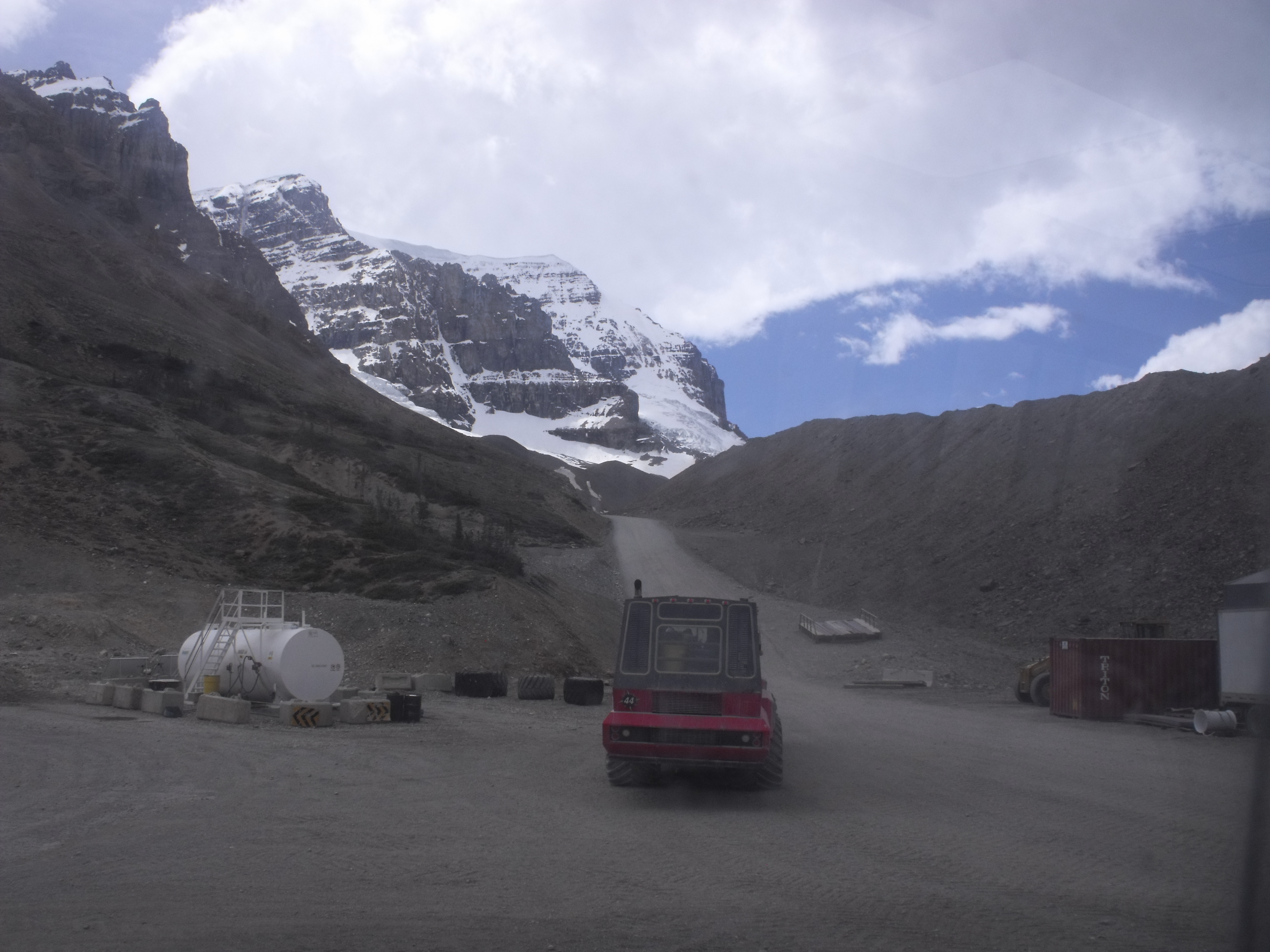 Made it to the Ice Fields Centre. The lot was packed which I am still shocked by but the funniest thing is the dress of everyone. We had winter boots, toques, ear muffs, vests, double layered coats etc. Jackie had shorts on but was multi layered. Hey I am on a trip in June I don’t need that stuff. I get in line with shorts, sandals and a light jacket. I did get some funny looks. We got our passes which I had pre-booked on a super special on line and headed to our bus. This special I saw advertised on TV gives us unlimited access for a year to the four major attractions in the parks. Our driver looked like 12 years old. He was funny as he was driving he said he just got his license and had practiced all day yesterday so everything should be fine. Turns out he was 18. Turns out every Brewster bus driver is very young. We headed to the base of the ice fields and transferred to our huge all terrain bus. A 6-wheel drive with about 44” tires 24” wide and a Mercedes engine with 700 horsepower. Amazing vehicle. Our driver was a young lady from Toronto named Ness