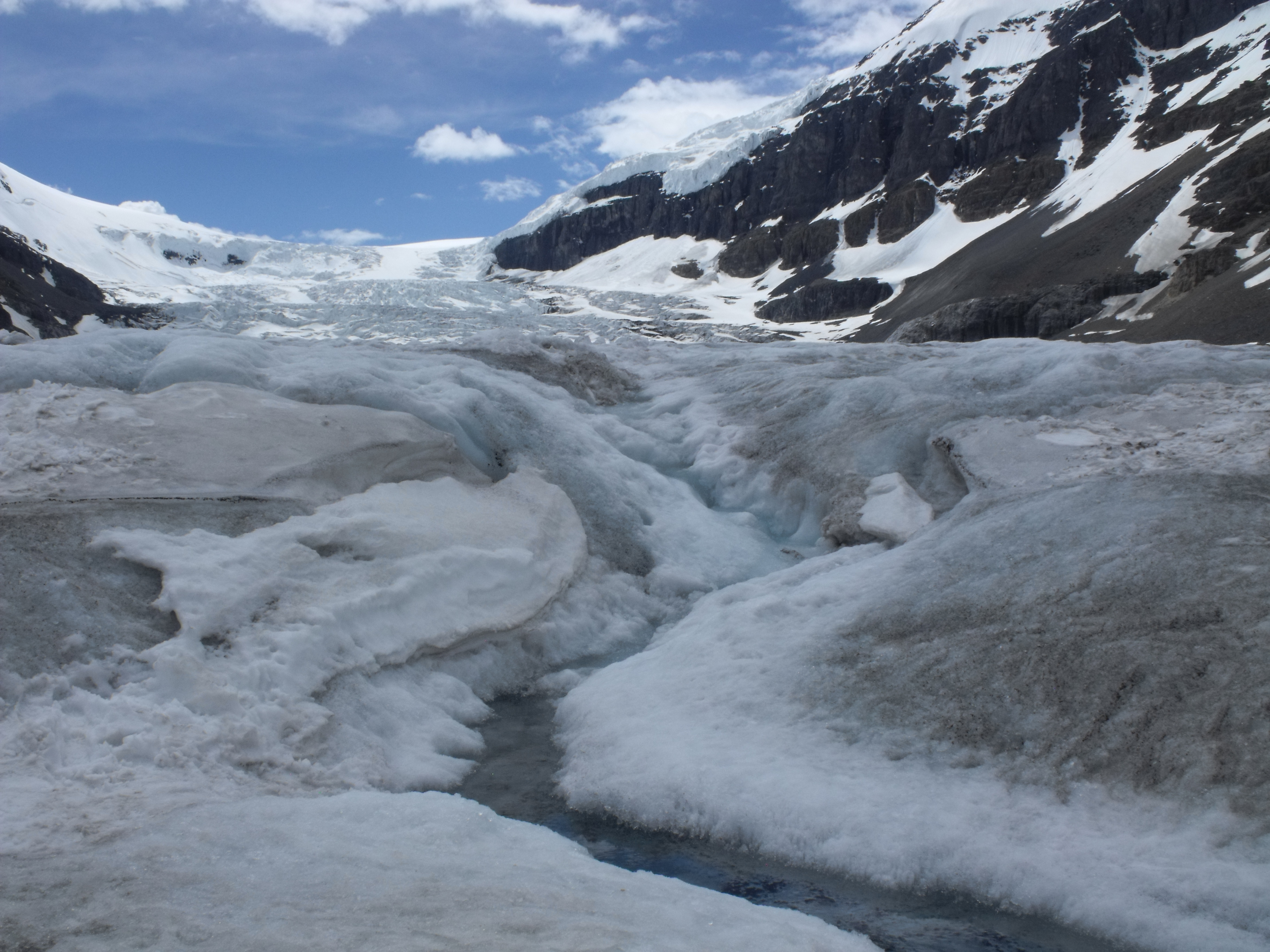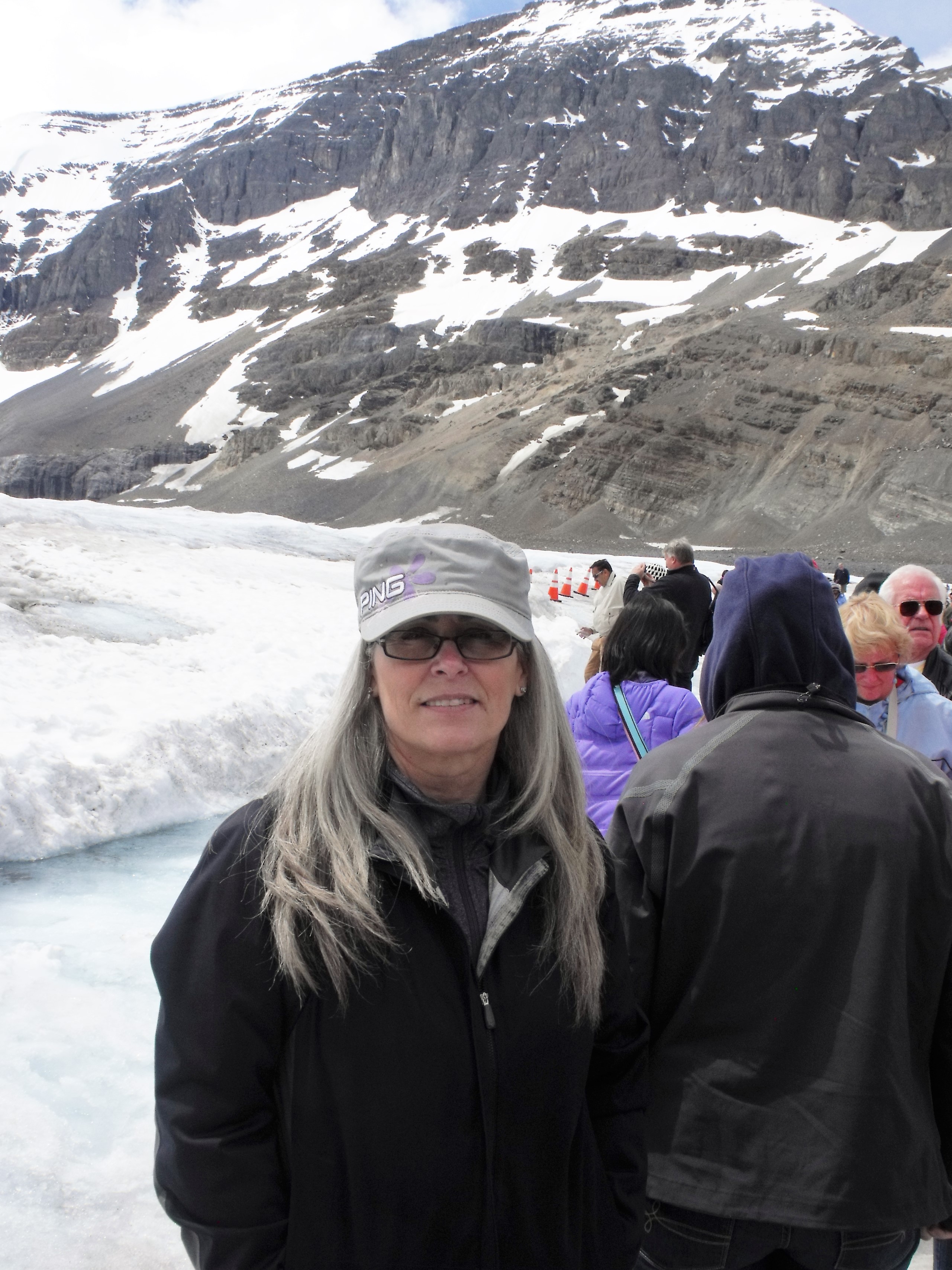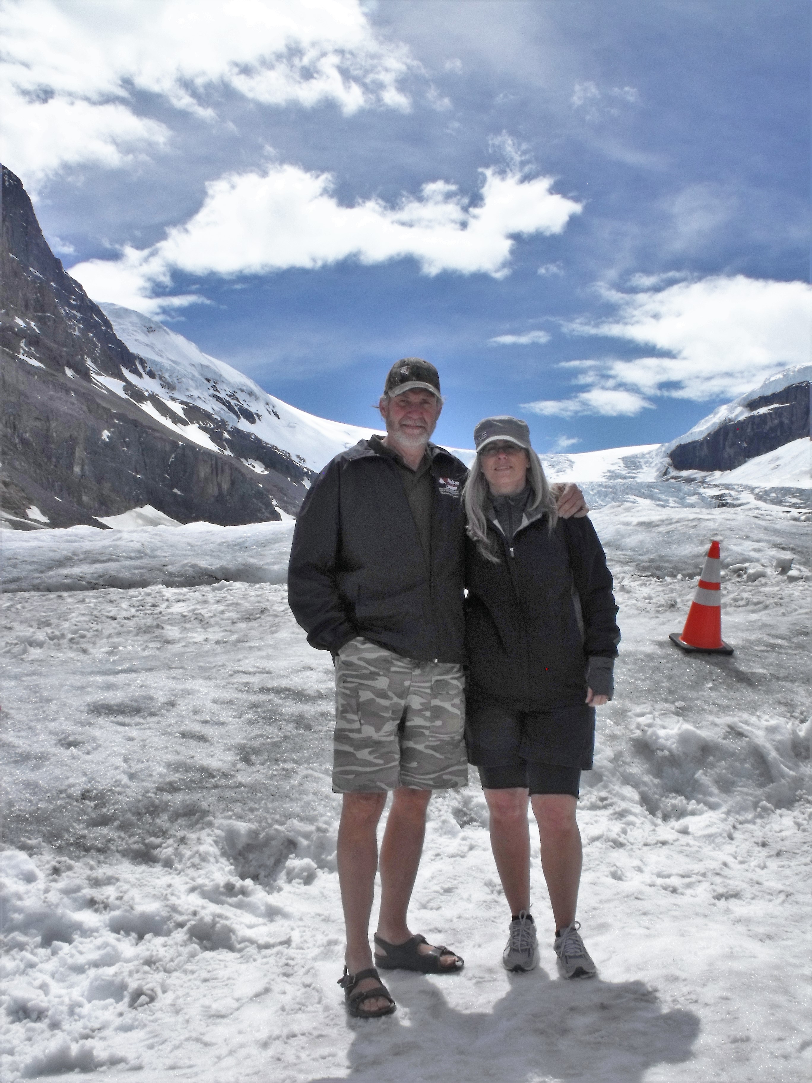who was extremely funny and an excellent host. I thought the “Big Hill” at 12 percent was bad, we climbed in this thing in low range down and up a 34 percent hill. Now that is steep. For those that don’t understand percent versus degree of grade here is the answer. A 12 percent grade is 7 degrees and a 34% is 19 degrees. (degrees=tan-1 (slope percent/100) The steepest road in North American is 35% in Pennsylvania. On most major highways you rarely see anything higher than 6 or 7 percent. At 6 percent and if it is long like some of the hills in BC you see a lot of over-heated vehicles sitting on the side of the road. TIP: turn off a/c and put heater on high as the core is an extra capacity radiator to help cool the engine. In low range in our monster bus doing about 5 mph we did well. We got some ways on the ice field with a lot of narration from Ness which was interesting and were allowed out to walk around within reason. They had cones to keep people from falling into crevices and pools. This is where my sandals failed. The huge snow boots and fancy hiking boots worked well on the ice. Mine not so much as they had smooth bottoms so I had to be very careful in walking especially now with a bad hip. We saw three people fall down on the ice. I was not cold at all as it was 17 degrees out but should have had a better set of shoes on. A fun excursion worth every penny and a great experience in our
