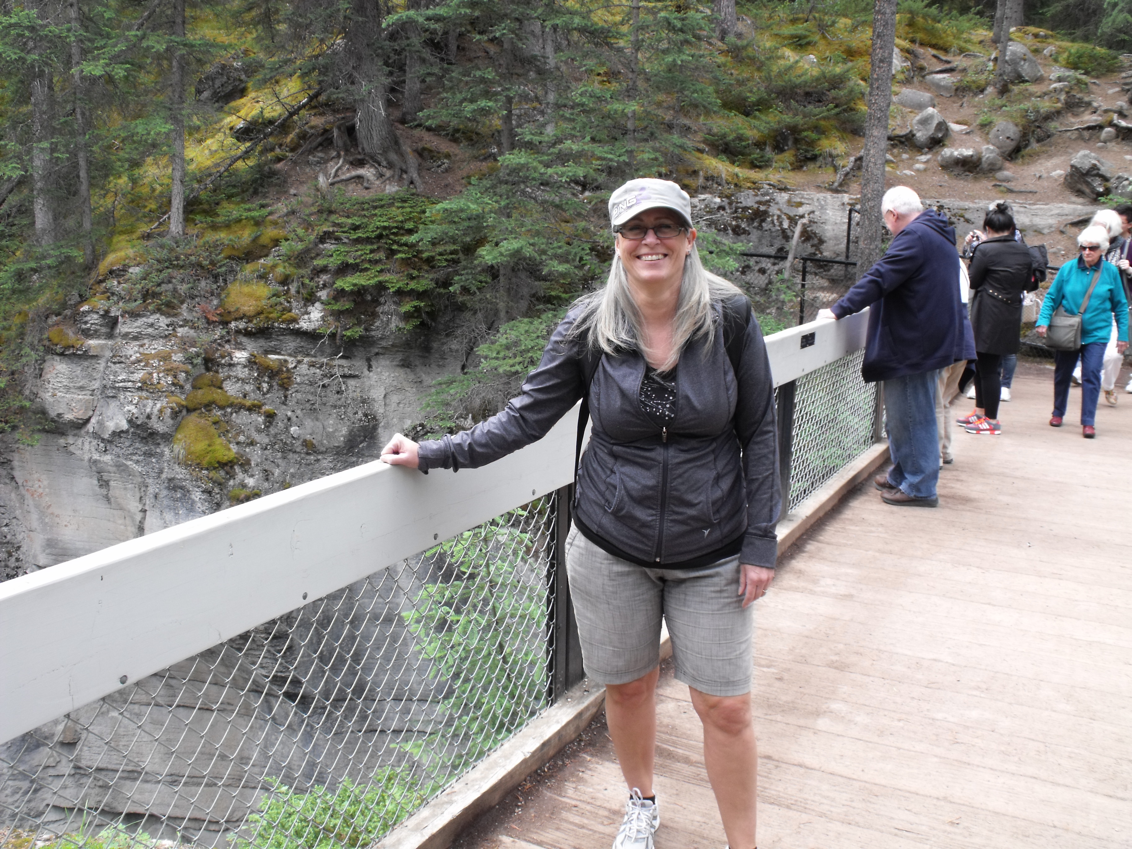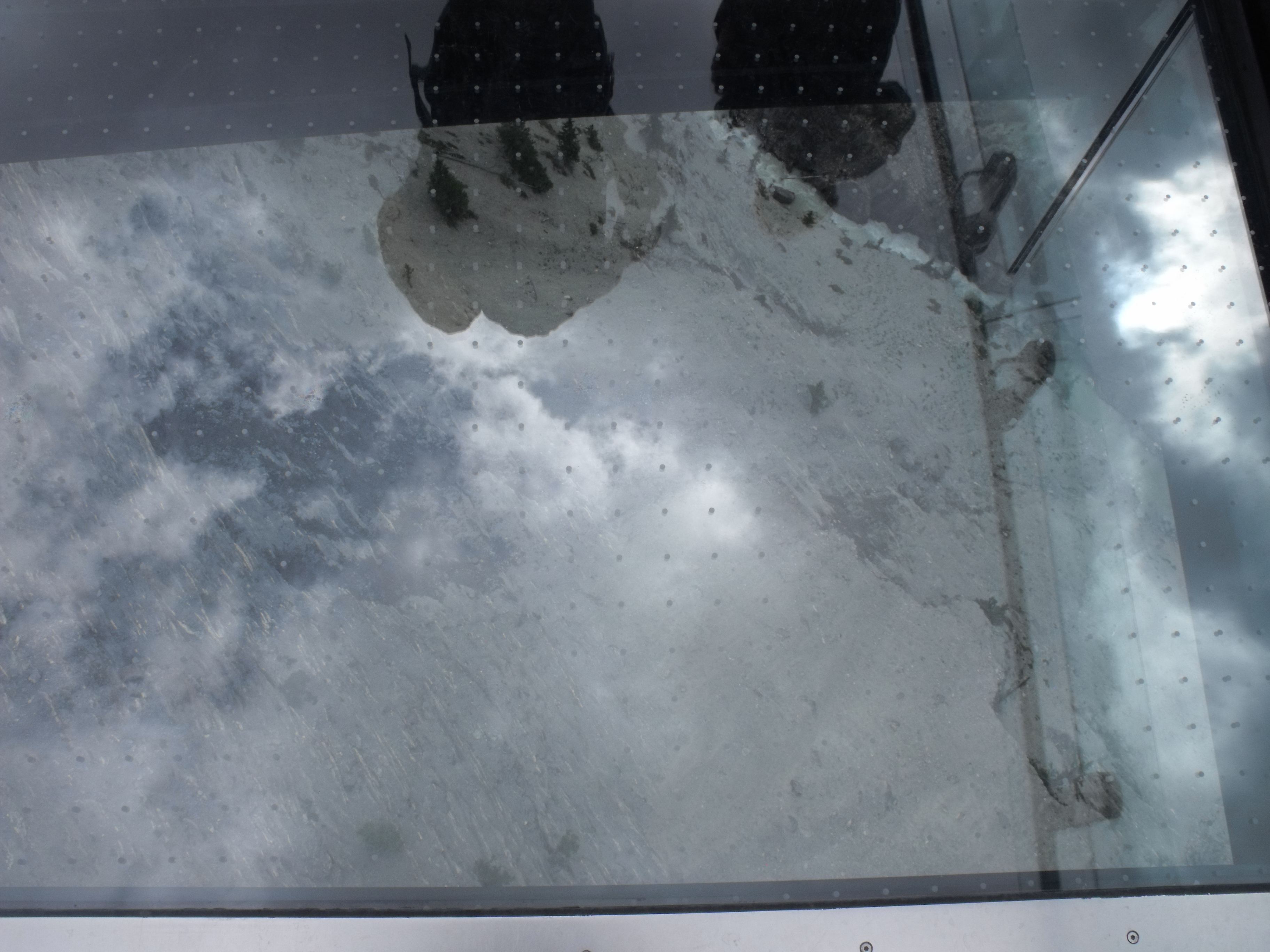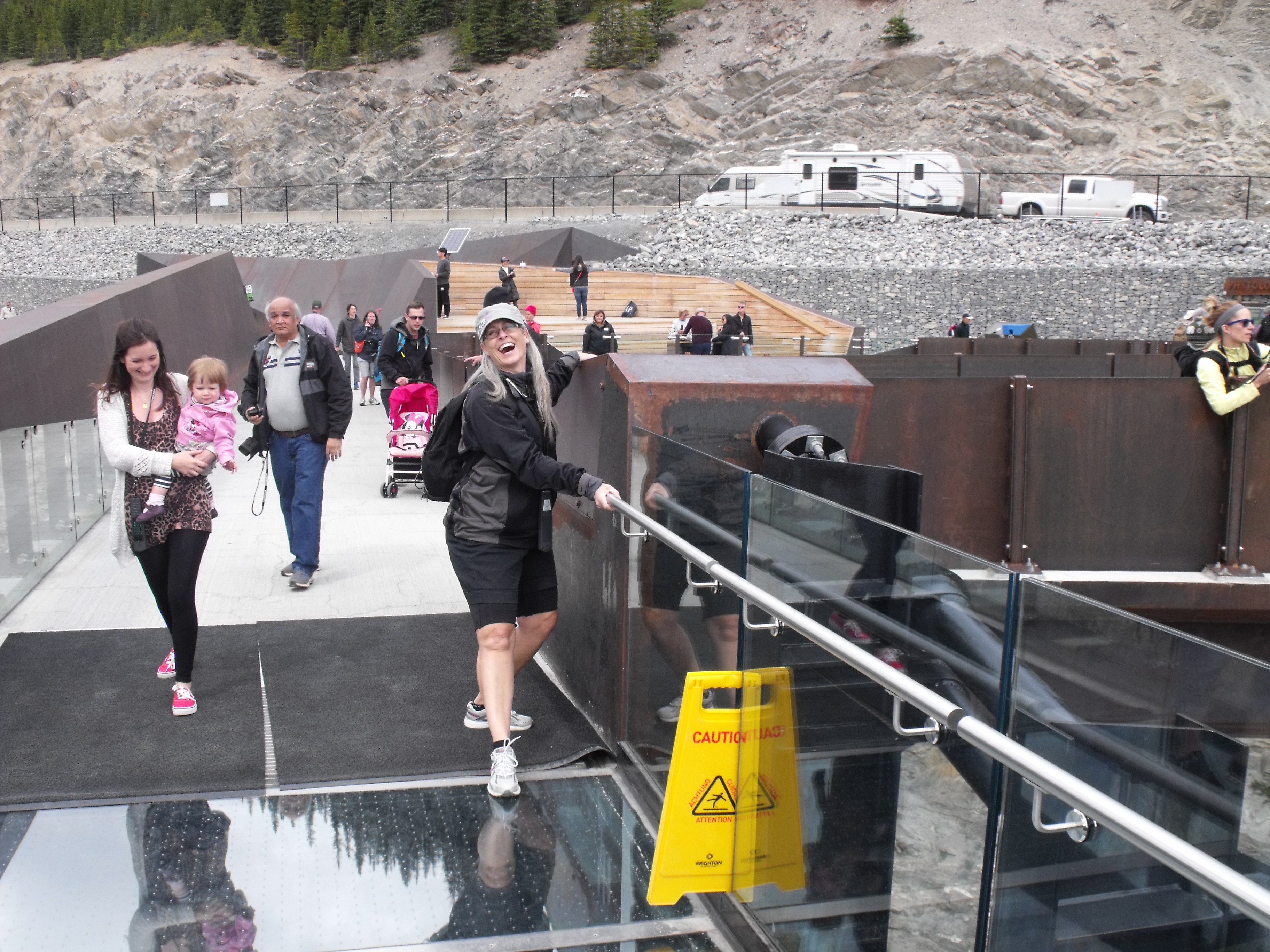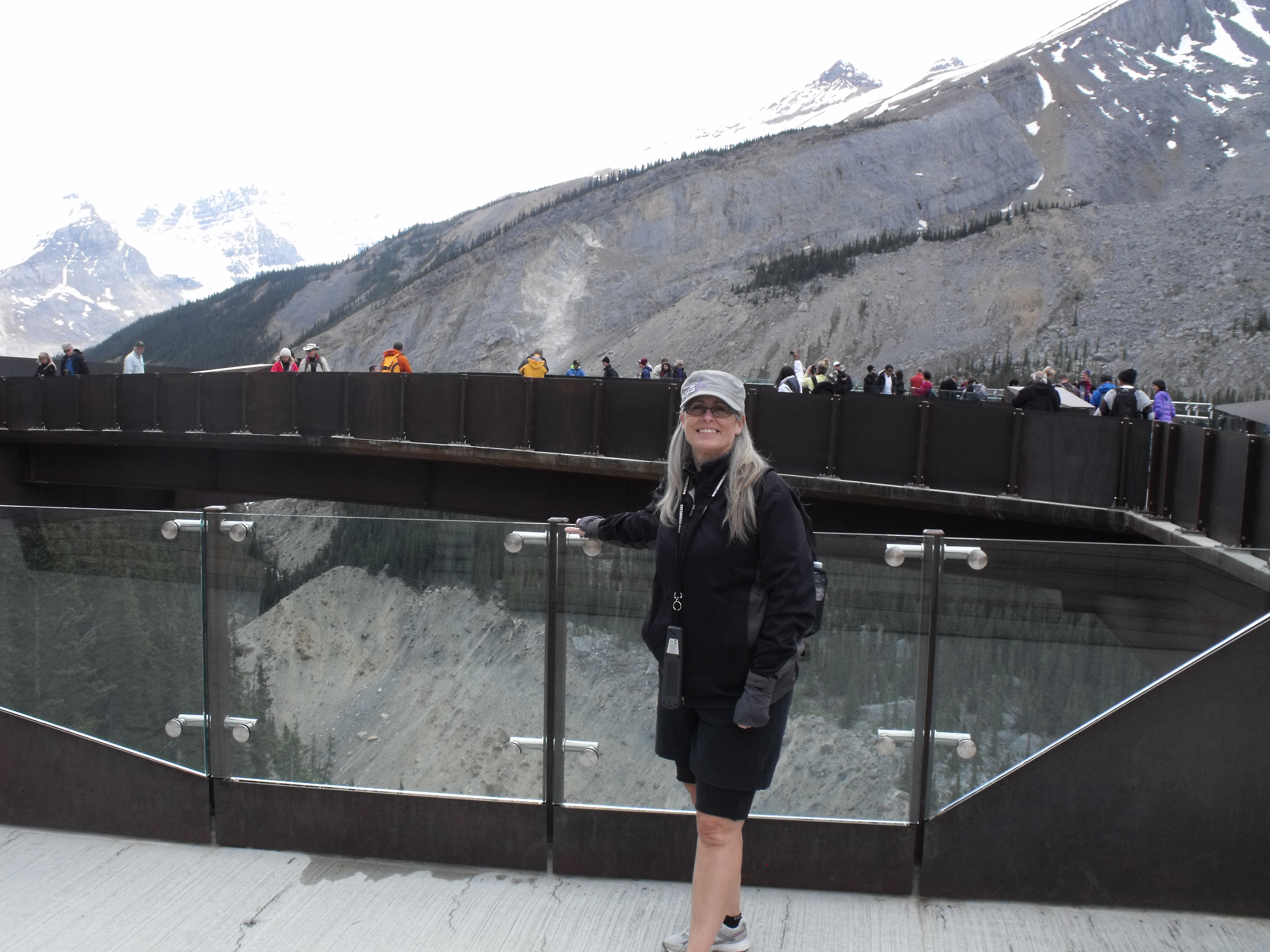 own back yard. It has been at least 50 years since I last saw up close the Columbia Ice Fields. On to another bus and up the highway 8 miles to see the Sky Walk. This is a glass bottomed platform overlooking three glaciers, a river, valley and waterfall. A great presentation along the way explaining the terrain, the history and animals in the area. They even had a portable audio presentation you carried with you and pressed the button at each station to learn something new each time. We finally get to the platform. First let me say it is amazing how many scaredy-cats there are. Numerous kids, men and women not wanting to walk on this platform. It is 913 feet from the bottom so double the Calgary Tower and equal the Stratosphere in Vegas. It protrudes out at least 50 feet or more and makes a half circle back to the cliff. Nice engineering feat drilling the beams into the cliff to hold the weight. The glass looks about an inch thick. Anybody that knows Jackie knows this isn’t her thing. I will tell you she did amazing. She actually walked on the glass and looked down. She wouldn’t go all the way around but still did extremely well for her. I was glad she got up the courage. Jackie was amazing and I am proud of her as I know how she doesn’t like this type of thing.