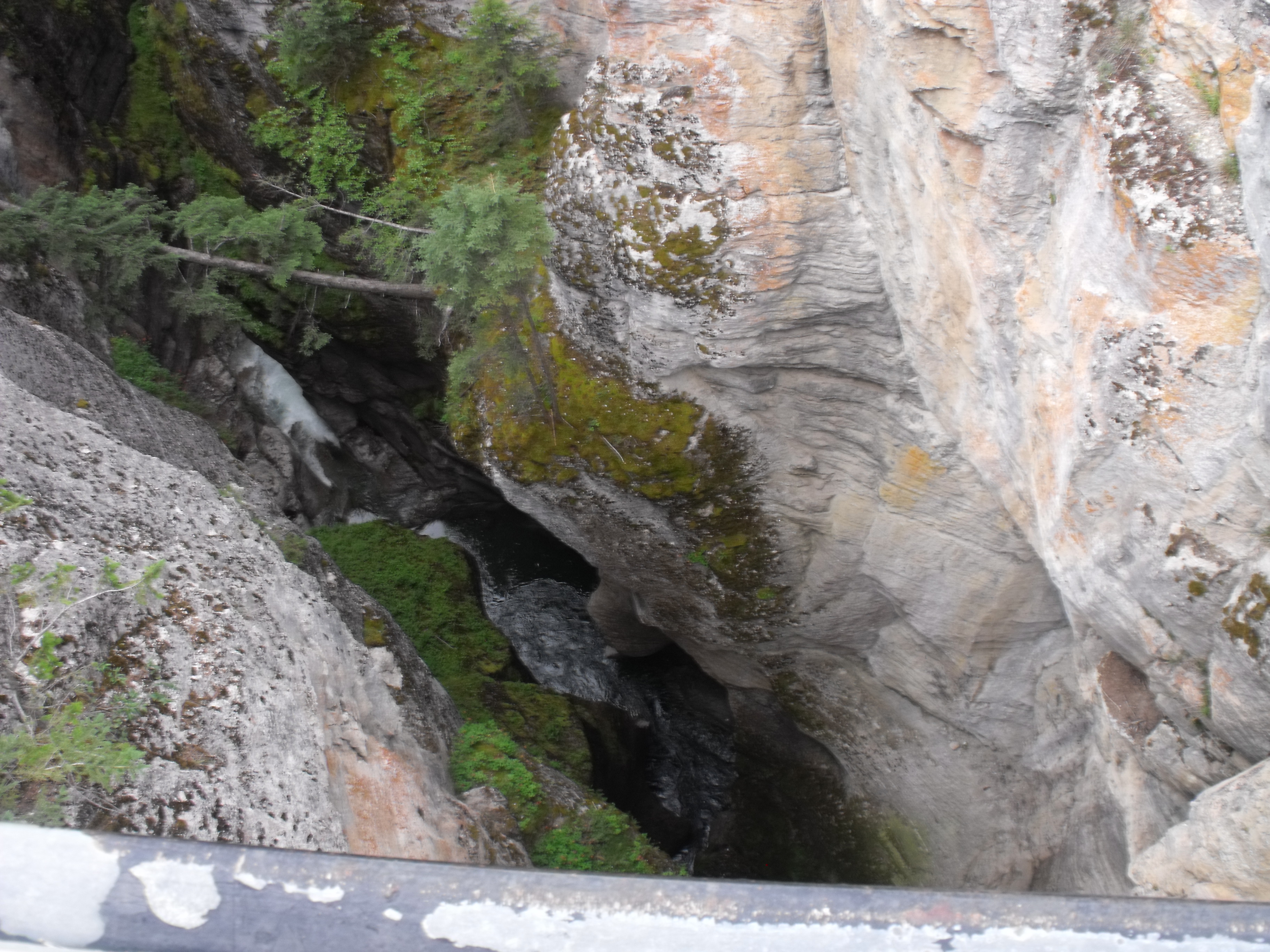 meals are expensive but is an exceptional place for a one of some time. We did our short tour and then headed up the highway. We are becoming just like Yellowstone Park where if anyone sees something a mass congregation of cars and people will happen even if it is in the middle of the road. Just to spot an elk or goat. It is quite funny. Our first stop was Maligne Canyon which is spectacular. I am sure as kids we saw even though I don’t remember it, but it is amazing. The gorge depth is incredible. What was equally amazing Jackie actually crossed two bridges over the gorge. Looking down it seems higher than the skywalk but isn’t. Just perception. The way the water has carved out this gorge is unbelievable. Lots of people checking it out including a bunch of old English guys on a tour. Their guide kept getting in our way. This guide sure will give a good impression of Canada. She dressed just like Sally Fields in the movie “Hello my name is Doris”. Plus, she had the thickest French accent. And she flirted with every old English guy on the trip. And she kept blocking the walk way. We took the shorter walking path due to my hip but we saw the whole gorge and waterfalls. We even tried a selfie with the camera which didn’t turn out bad. They are smart making all of the trails end right in the gift shop and the bathrooms at the back of the gift shop. Impulse buying from vacationers to the max. We had a nice picnic lunch right at the gorge at a table there and then carried on. Fun watching the huge amount of rental RV’s trying to back up and find a parking spot. A wonderful windy scenic road with a 60kms per hour limit. Numerous pull over spots for sightseeing overlooking lakes, falls,