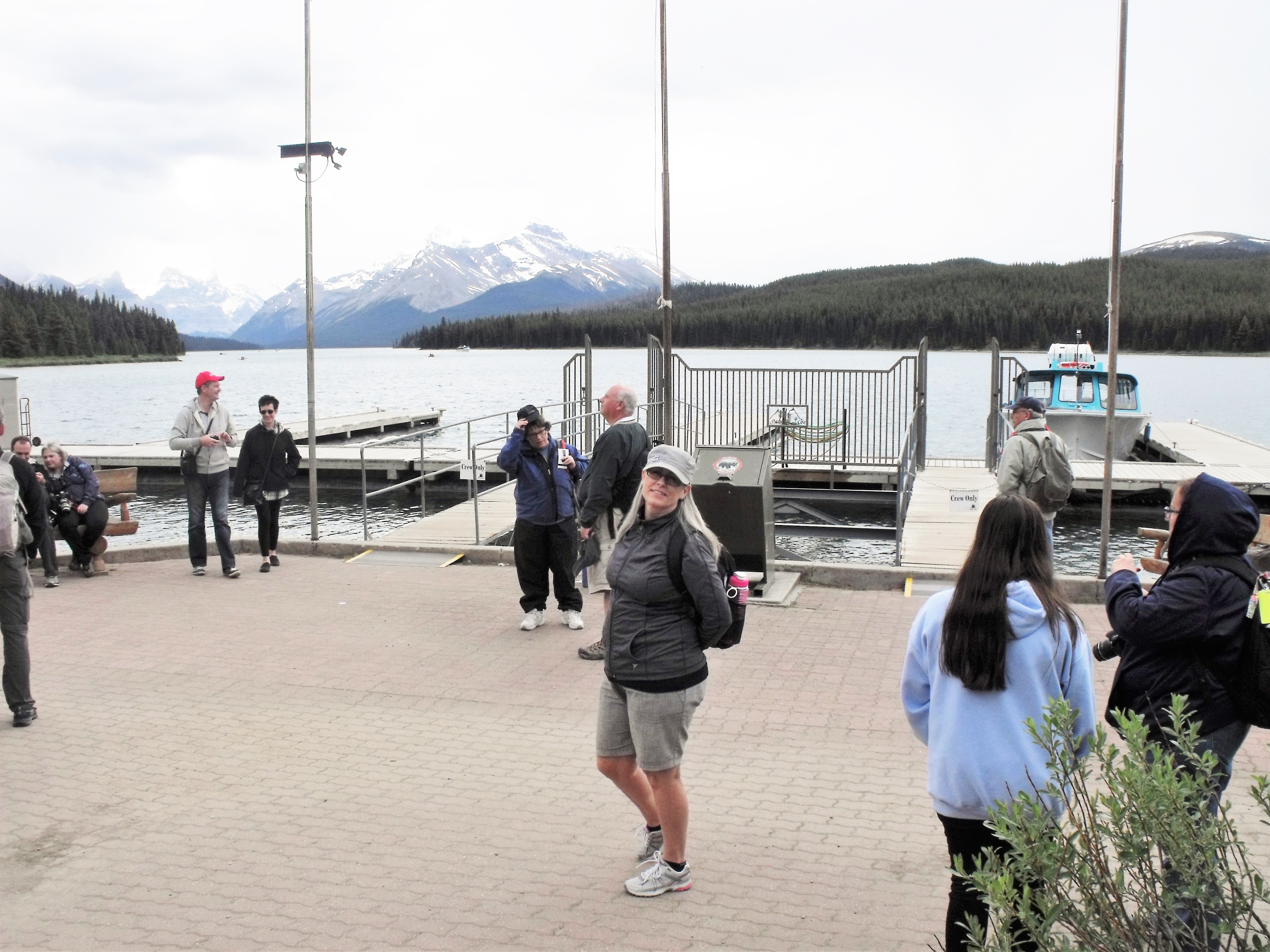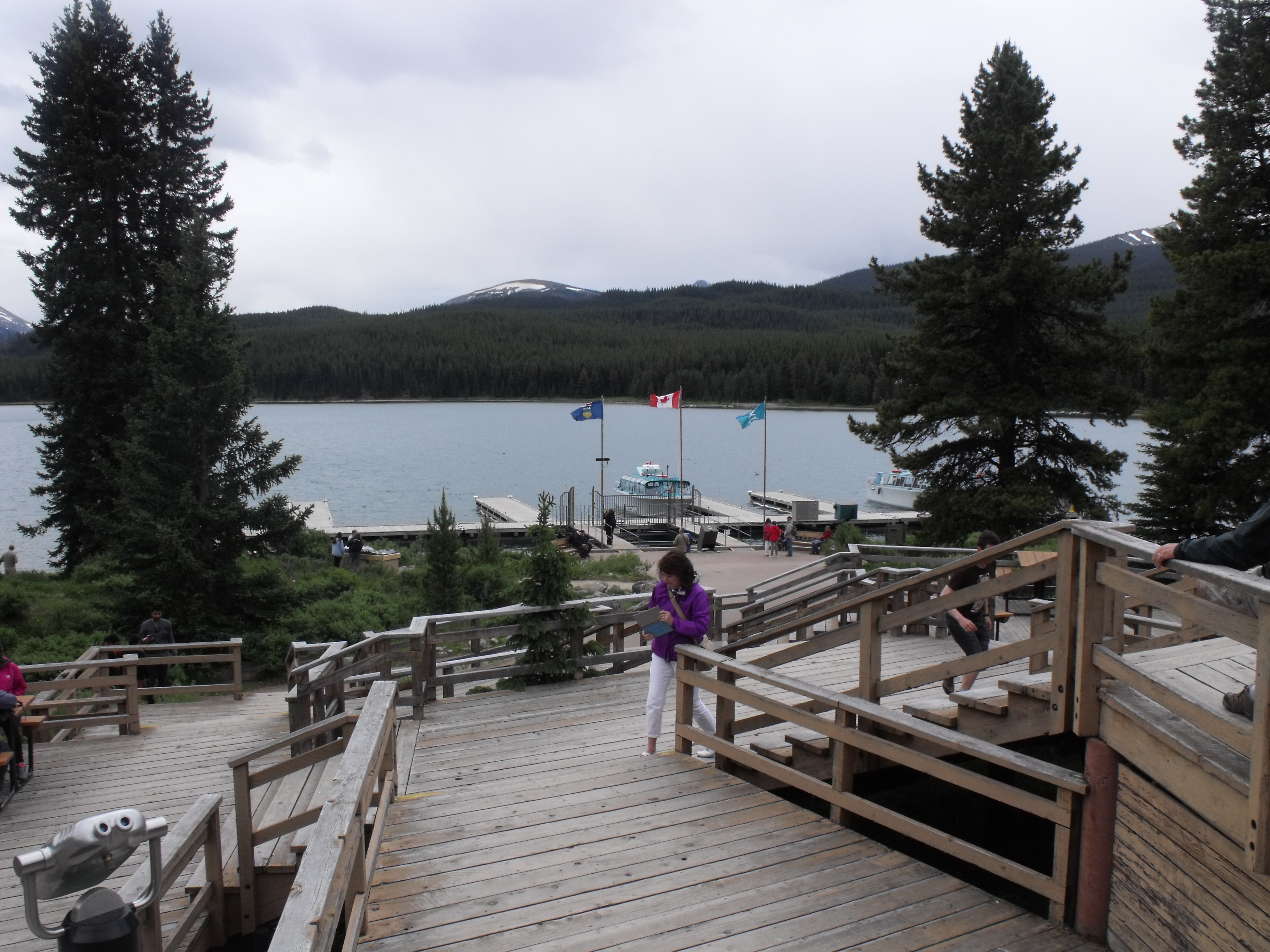 and rivers. On arrival to Maligne Lake we parked and then headed to check in. Again they were busy and we had to wait one hour for our turn on the boat tour. Checked out the gift shop (didn’t buy anything, yahoo!) and then sat down for a tea and pop in the restaurant. This overlooks the docking area, lake and glaciers in the background. On our tour I discovered what makes the lakes that beautiful turquoise. Only glacier fed lakes get like that and it is caused by the sediment in the water from the glacier reflecting the light back to us. Supposedly the way we see light is different from other creatures but they see a different color in these lakes also. The side of the lake where you enter looks like any other lake and the further down the lake as we got closer to the glaciers the water just kept getting more and more beautiful. They have great boats for the tour that work in any kind of weather. They are very similar to cruise ship tenders but with more glass. The tour is a 90 min deal with a lot of travel past some interesting points. The guide was from Toronto and her first year working here but after a two-month training period was excellent. Brewster’s which just bought this company from an independent has a great staff training and selection process. Awesome staff. We arrived at Spirit Island. I was expecting a little more but it is what it is. A very small peninsula that we weren’t allowed to walk on. They docked us and we de-boarded the boat. They had a great walk path around the shoreline and even a toilet for the customers that was hi-tech costing $250k. Yes $250,000 for a toilet. It uses solar energy to flush the toilets, stir the sewage and then pump it up into the rock base as a septic field. Ingenious and works well. On our boat we had people from all over the world. The guide went to each person to ask them. Brazil, England, Australia, New Zealand, Holland, and Germany are a few I remember. The guide explained the fish stock in the lake. $30 a year to fish here. Eastern Brook trout were first introduced but they were not desirable to avid fisherman due to their lack of fight so a little later rainbow trout were introduced. They have not stocked the lake for 40 years as the breeding is good enough (no ice fishing) and 2 per day limit works.