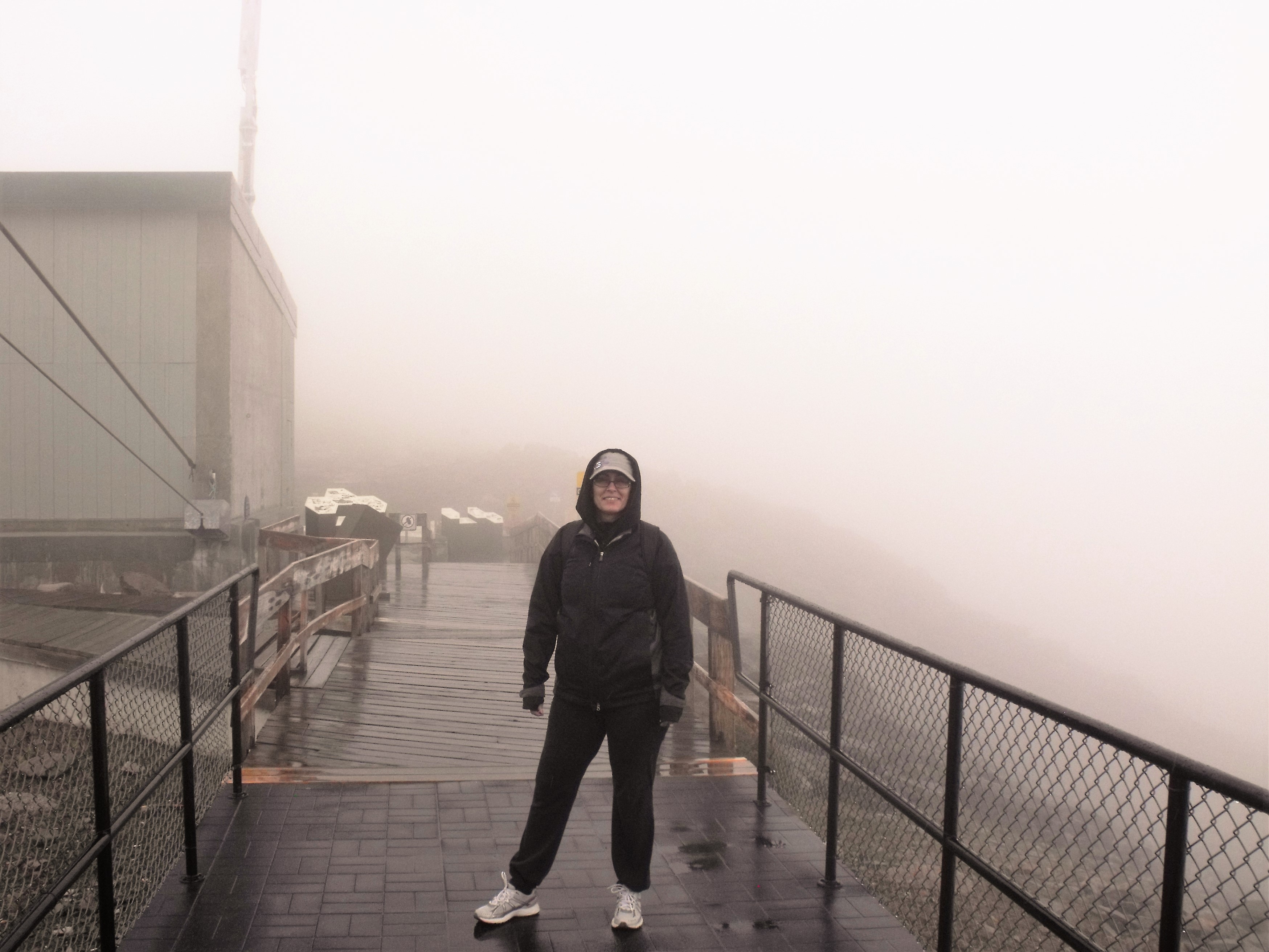 temperature up there according to the gauge was about 7 degrees and the digital sign from the satellite stating it was 4 degrees. After our climb we stopped for a hot chocolate and a small fry to warm up a little and wait for a break in the cloud cover. Didn’t get lucky. So we had a great ride up the mountain, only a 5-minute window to see the valley, fantastic eerie fog on a walk path and an enjoyable event. I noticed they now charge for hikers coming down. Years ago, 1973 to be exact they used to give hikers a free ride down. I climbed the mountain and rode it down with a bunch of school friends.