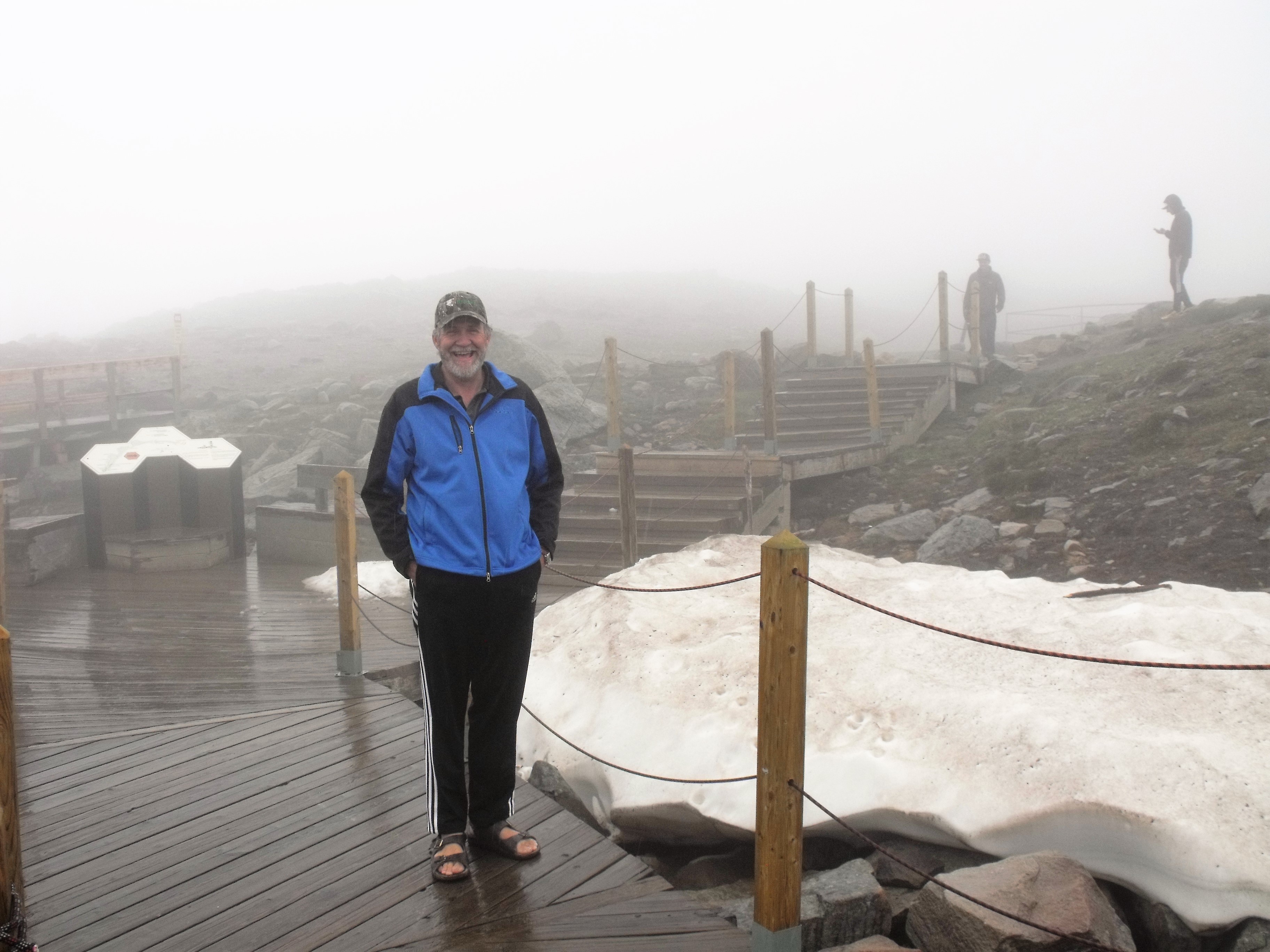 Had our smoothie breakfasts and decided to wait until after noon to go out as it was spitting a bit of rain. I did manage to go for a bike ride and found out that the hip works perfectly on the bike which is excellent. Neat to ride around the campsite and see the different and variety of units and their set ups. Huge 48 footers and small pup tents mixed beside one another. I enjoyed the ride and travelled quite a distance. Didn’t get to wet. Read and bit had our lunch and headed out to our adventure today. The first time we went up the gondola was with Keith & Jenny and kids. I remember getting to the top and Jessica wasn’t able to sign the paper in the glass box that she made it to the summit as she was left handed and couldn’t quite get it right. On our arrival it was drizzling a bit but it was cool enough and wet enough it was the first tourist attraction we were at that wasn’t packed. This wasn’t included on our package as they put in the Banff gondola instead. So $80 for two and we were going up (and hopefully down). We only had four other people in our car that holds 30. Great for taking pictures. BUT wait, we were right in the clouds. Only for a moment were we able to see the town of Jasper or any other thing. Got to tease the guide about having such wonderful views making it a great deal. NOT. Made it to the top and went outside to start our climb. Ran into three young gents coming down the mountain that were very disappointed as they reached the summit and could not see a thing. In fact, during our walk the fog/cloud cover was so thick we could only see yards in front of us. Jackie didn’t like the fact the cliff was right there along our walk path. I had my smooth bottom sandals again today which on the wet rock wasn’t the best choice. It is summer who needs boots or shoes. Feet did get a little cold as they got damp, a little dirty and the