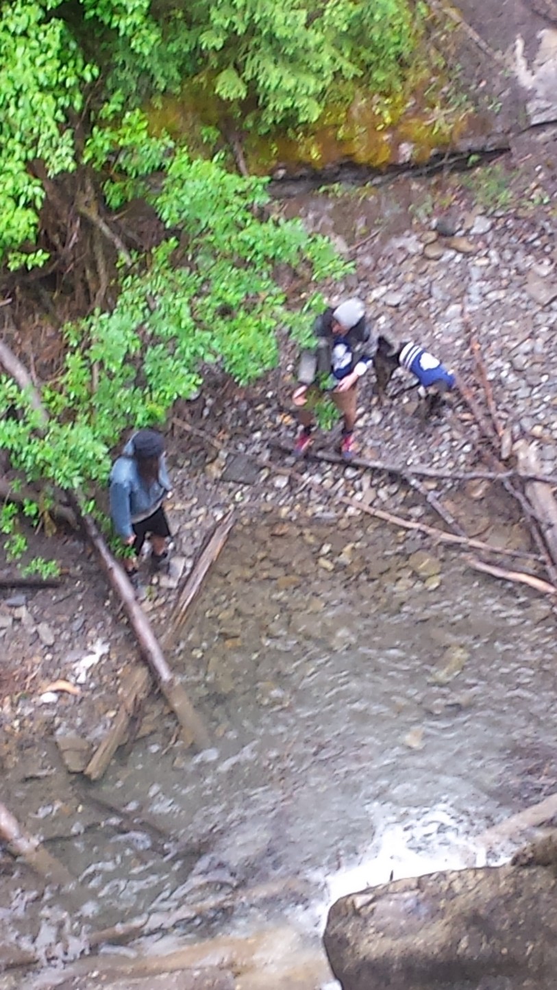 deal for us. Four kids from back east that were here planting trees were out for fun. One smart one stayed up top and a girl, with two boys managed to slide all the way down with their dog. With the rain making the rocks and the very steep slopes slippery they were struggling to get up. In fact, they couldn’t. We stayed for a while to watch and then left but not before saying “just throw your tent down with a thermal blanket and they will be fine” Kids nowadays. If they tried to get up the rocky side they could fall and hurt themselves. If they tried to get up the normal side it may take them some time but perhaps on all 4’s they make it. They may not think it is so funny a little later in the day.