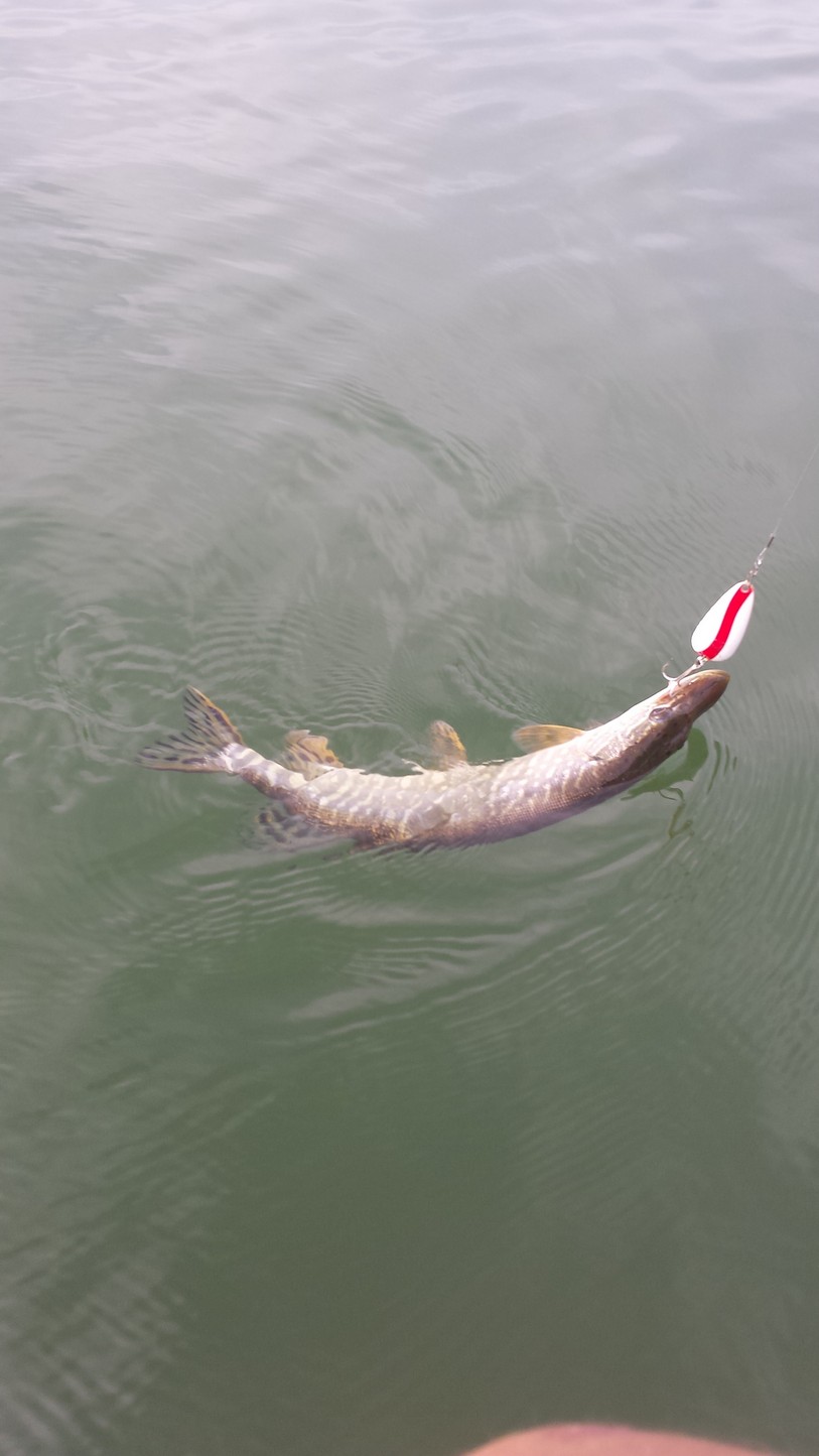 done I was ready to start fishing about 7:30 am. Within 10 minutes I caught my first fish. Always like that feeling no matter what size as then you didn’t get skunked. That is the fun of fishing when you feel that little tug on the line not knowing if it is a weed or bite and then when the fish hits it feels awesome. I was kept quite busy, tying knots on spider wire (pain in the ass), lost hook in weeds, going around in circles hooking up while not noticing but especially busy taking off fish. A whack of them the same size around the 4 pounds which is still a nice size fish. I have caught smaller. I caught 8 fish in the first two hours with a couple being around the 8 pound mark. My scale battery died but it was a good size. Then it slowed down a bit but catching 10 pike between 8 and noon is pretty good fishing as I lost or shook off the hook right at the boat another 4 or 5. The only big Pike I saw was awesome. I had one of those smaller fish on and about 10 ft away from the boat a large pike attacked my hooked smaller fish. I watched the whole thing unfold right beside the boat. I was hoping to land a two for one but no such luck. Vicious fish though.