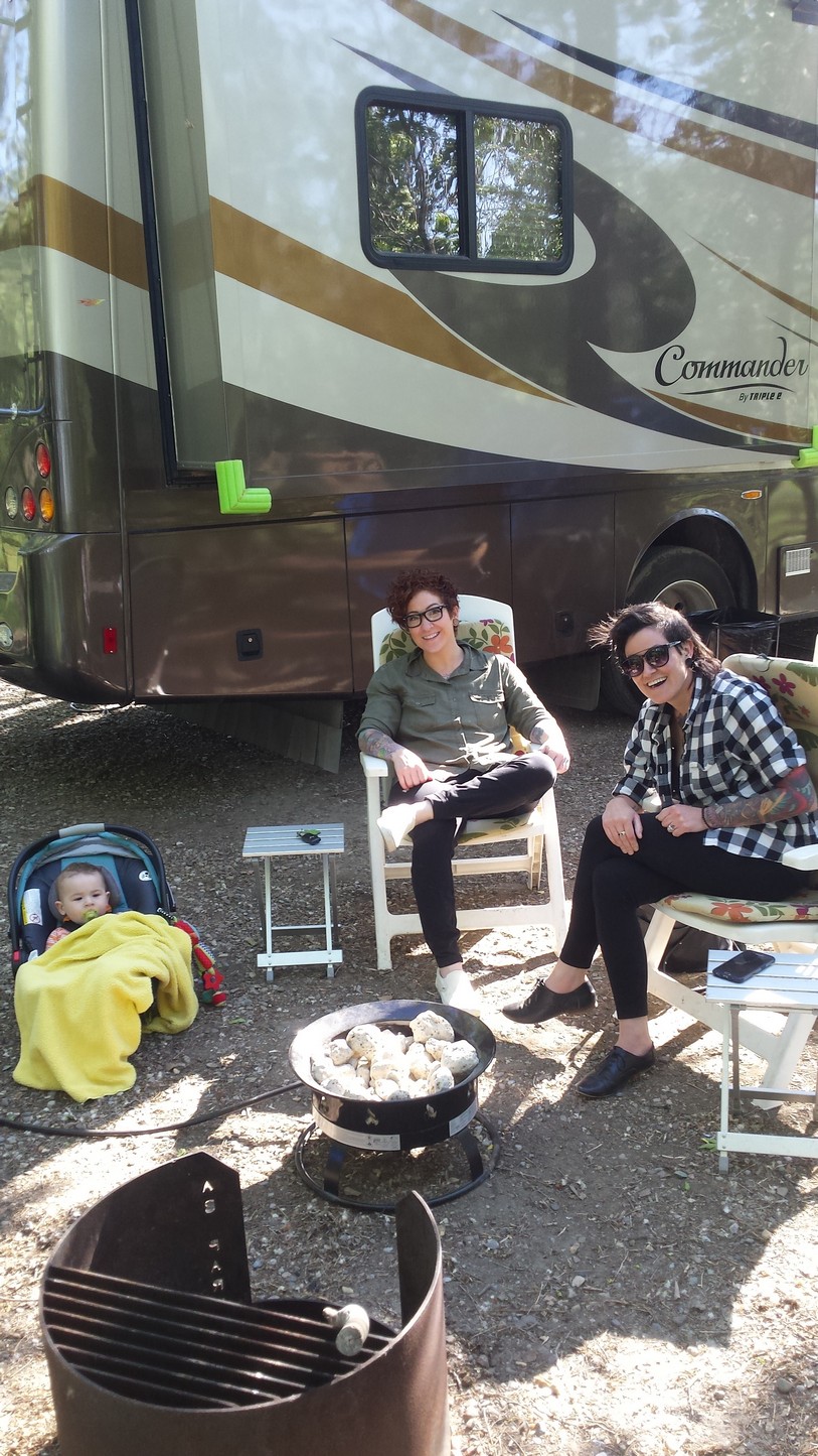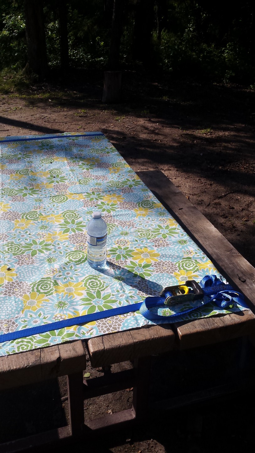 Sat outside to have supper and used our new fire pit. Lots of flame and heat and no smell of smoke except from the campers near us. I love this thing. I would use at least 20 bucks of wood per night and I believe I should get at least three nights out of one 20-pound cylinder. Very few bugs out which was nice also. It started to drizzle and we pulled everything under the awning and enjoyed.