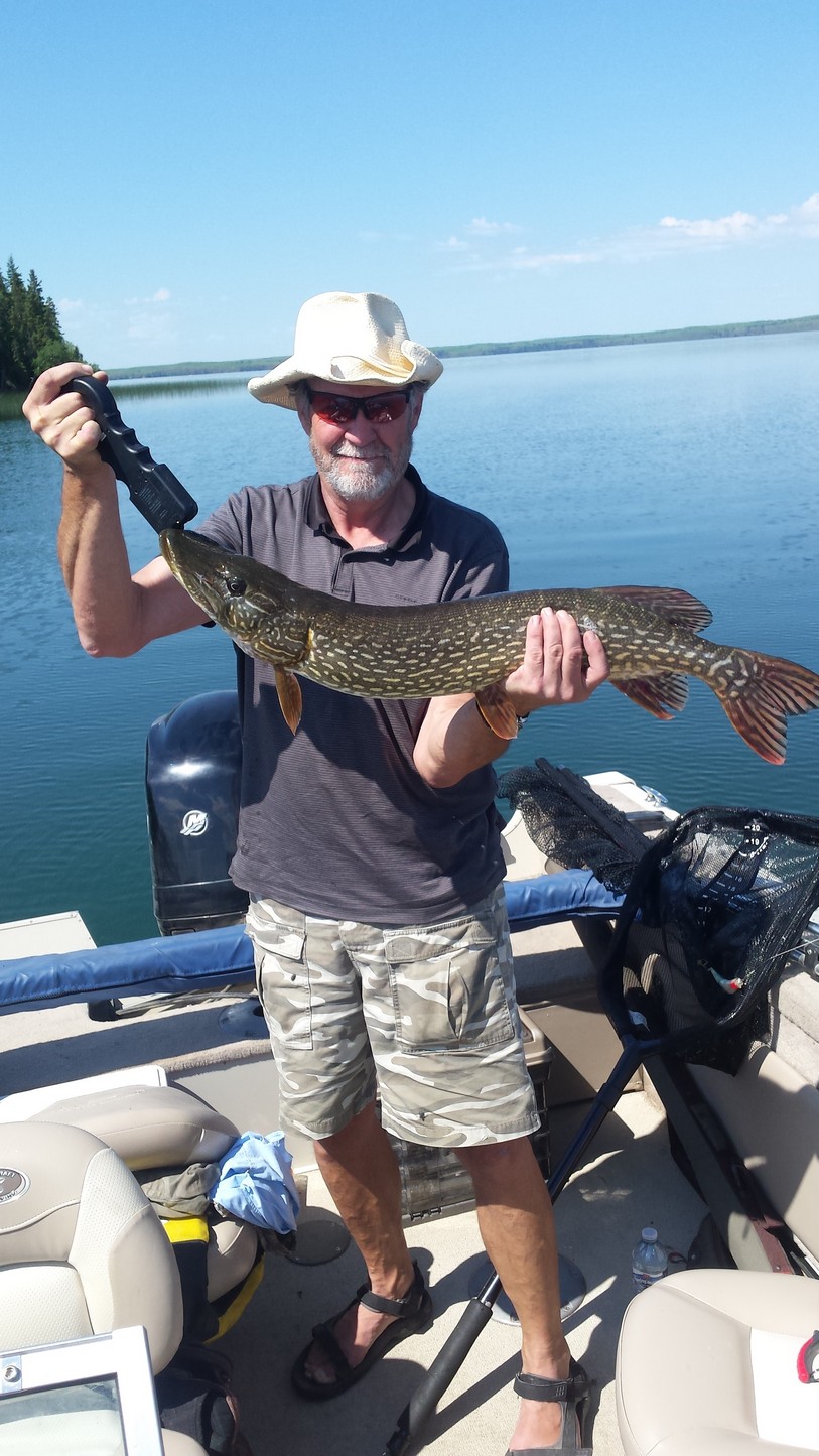 First day fishing. Weather hit 28 degrees. Water was like glass. It was beautiful. We caught over 20 fish the first day. The fish were coming in on a very consistent basis. Then Fred catches a monster and spoils the fishing for the rest of the day. How can you beat a 18 pound plus monster pike . This fish is 19 years old according to the weight charts. It may take one in every 1000 fish caught Eveto be that size again. It was beautiful. It sure was a good thing I managed to net him correctly or we may have lost that one. LOL NICE FISH and I would love to catch one that size. I will keep trying.