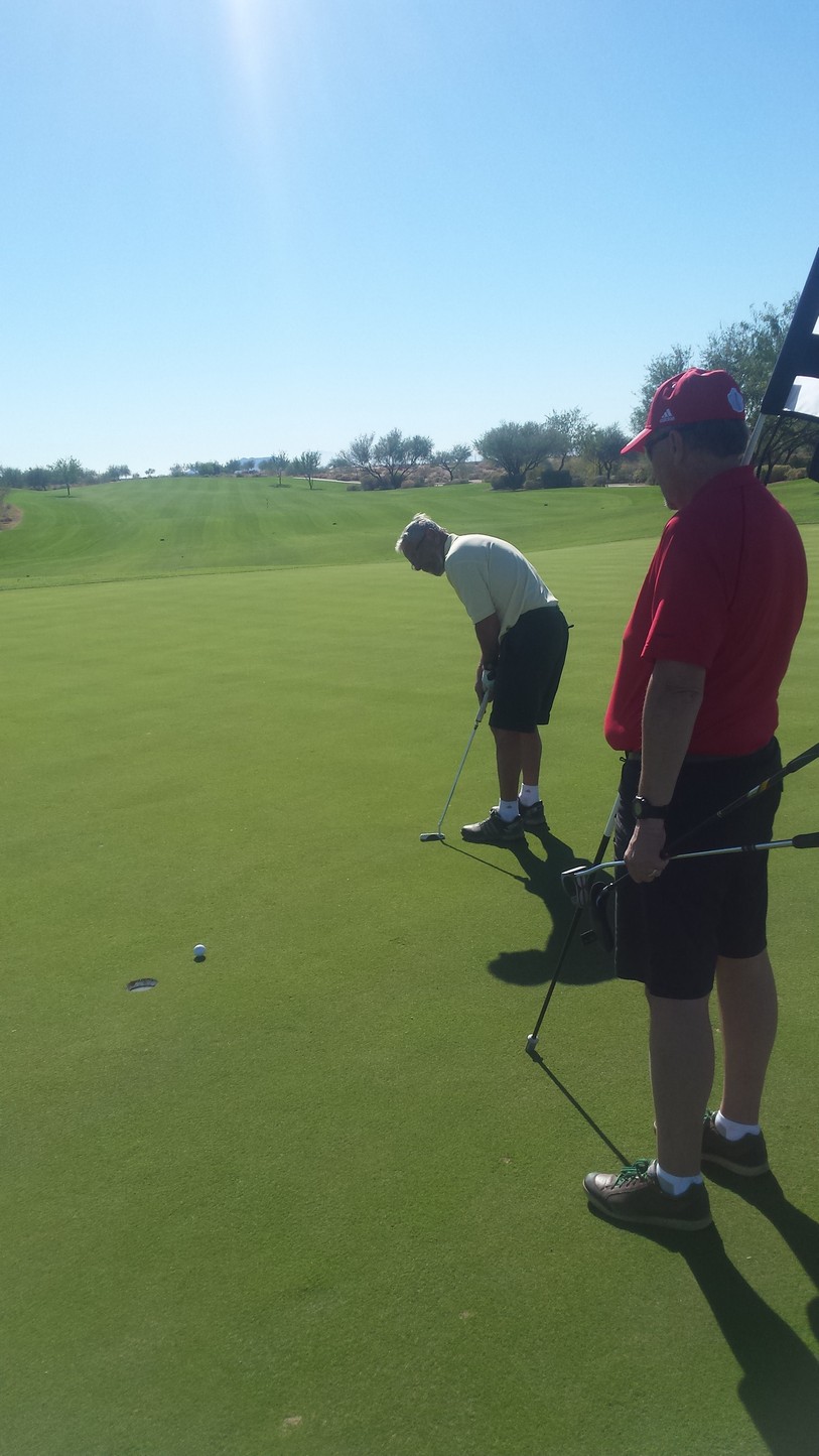 Up this morning and out of the house by 6:30am. And a good thing we left early as there was a 5 car pile up on the 202. We arrived at the clubhouse only to find out they have a 1.5 hour FROST delay. Frost delay in Arizona !With the windows out and me driving Bob this morning I thought I had picked up the Michelin man with his layers of clothes. It was 3 degrees when we arrived at the course. And the drive with the heater on full blast wasn’t bad at all. Well I won money again so things didn’t go that bad at all. It wasn’t a stellar game for me caused by three holes taking two triples and a double. Any score in the 80’s I am ok with but need to get rid of these dumb mistakes. Lots of pars and chances for birdies but no luck. Bob played exceptionally well scoring a 34 on one nine. The temperature increased quite rapidly which helped. Another fun day in paradise.
