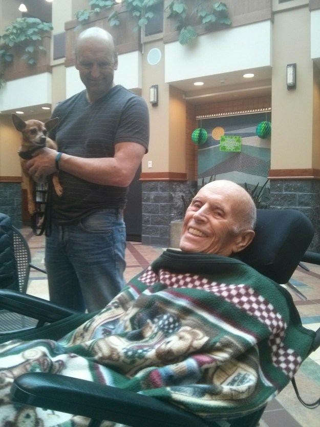 We had a nice visit and evening with her with Mom feeling quite well and comfortable but tired. Getting up in the morning everything was going well even though she again said she didn’t sleep well. She is fanatically clean so she started to gather a bit of laundry to walk down the hallway about 50 steps. Arriving back in the suite she sat down for a break and I went to fix her walker and asked where the wrench was when it hit her. It appears to come on quickly not something that she can feel is coming. Confusion, unable to communicate properly, headache etc. We called the center’s RN up for an evaluation and we decided to call the ambulance. Strokes are scary as to the damage they can do. She didn’t want to go but we finally had her loaded in the ambulance and headed out with sirens on to the U of A hospital which is the main stroke center for Edmonton. It is sad to see the fear, anxiety and tears happen with the stress adding to the situation. I am going to say the U of A hospital is EXCEPTIONAL. Within 5 minutes of arriving at the emergency they had Mom moved to the back private room and numerous nurses and doctors looking after her. Not good service but EXCEPTIONAL service. They have some pretty well renowned and recognized stroke doctors on staff. For the next few hours it was pretty amazing the testing, cat scan, X ray, sensors, machines, more testing etc going on. The nursing staff were very very competent, professional, accommodating and nice. Mom isn’t the easiest patient as she is very strong willed but the nurses convinced her on everything and handled it so well. I am not sure of the exact time but I would bet only a few hours passed and they were able to move her to a ward bed with only two occupants to a room. Her partner is another story but still very lucky. The unlucky part was the noise generated by her room mate. TV on, cell phone and the noises from a feeding tube were not nice. The ward nurses again were EXCEPTIONAL. And it is funny now as the young RN’s and trainees would come into the room I would say to Jackie ” Look Sugar Lash” referencing Victoria’s new job and the fact three of them had beautiful looking long eyelashes. For anyone to say our system sucks for cases like this, has to be insane as from Paramedic to hospital nurses and doctors in this situation only 5 star, first class, and exceptional can be used to describe the experience. Next day a whole new battery of testing going on including a MRI which I think everyone would agree is a horrible test. You would think they could quiet that machine down. Again wonderful nurses helped calm down Mom and she endured the test extremely well. I do have to say though going in to the hospital you can be assured you are not going to get any rest or sleep in particular. We drove up to Edmonton expecting to help Mom have a recovery time for one or two days but it ended up being quite a while. We didn’t bring a change of clothes or anything to use over an extended period of time. Luckily I thought to bring along my BP pill dispenser so I was ok. Sleeping in a hide a bed in a strange place, new noises, different temperatures, in not so private home and not having been prepared for a longer haul than expected wasn’t fun. It is not the same as having your own room, being able to cook for yourself, and it is away from home. Besides for anyone that knows me I HATE hospitals, and elderly homes. I hate the noise, the smell,the germs, the contamination etc but Mom’s place is one of the best I have seen with our experience with Jackie’s Dad. It is the correct place for Mom as the company, the events, the food prep , and her room is beautifully fixed up. It is in the independent area which is nice. It is ridiculous they charge so much for visitor parking at hospitals. In the patients interest it should be free. The hospital has some nearby food venues and a great in house food court for us to eat at as we had two or three meals each day there. This being her second TIA in four days the doctors worked hard consulting with each other including her past doctor from the Grey Nun’s hospital. After all of this the conclusion is she is not having TIA’s but having seizures. We had a long discussion on this as I wasn’t convinced with her face drooping. After it all I understand. The short affect of the drooping is the minds memory and weakness in the muscles from her actual stroke. So new pills are going to control this. The main triggers for the seizures are supposed to be stress, being over tired and dehydration all of which can be managed. The pills are supposed to eliminate this.We organized her pills, organized with the home her food requirements as she has a test coming up with specific needs, bought groceries for her to use her self, arranged meal delivery, changed light bulbs etc. I was impressed with her eating as everything she liked she ate which was awesome.