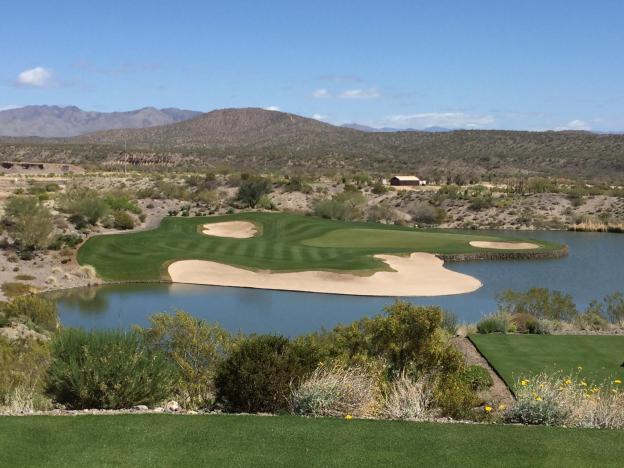 Best course ever. I got to golf Wickenburg Ranch which for no other word was AMAZING !! This hole is an elevated tee box over the lake at 175 yards to the green Par 3
