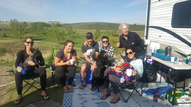 MAY LONG WEEKEND Having a break. I think Jackie may have had one too many LOL Trochu Golf & Country Club this year which was perfect with the campground right at the course and the course being very unique and fun to play. Lots of wind though.This weekend is always fun with the potluck themed supper, golf and gathering and has been a traditional things for many many years. Kieth, Jenny along with us went out May Long before we were married. The group is getting bigger as kids start buying RV’s. This year we had Penny & Jessica ( new RV), Amanda & Justin ( new RV) Troy & Jen ( new RV) Cor & Tor ( new RV) Ron & Merle ( new RV) along with Kieth & Jenny, Fred & Terry, Ralph & Tracy ( new RV) and us. Love the potluck.