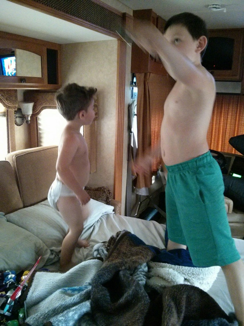 Bed time. Not. Let’s jump. Bed at 9 or 10 but not getting up to 9 is a good thing. A week long adventure with August and Jackson out at our lot.