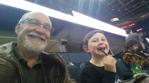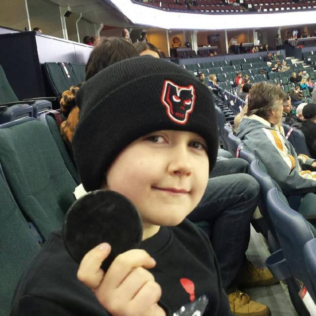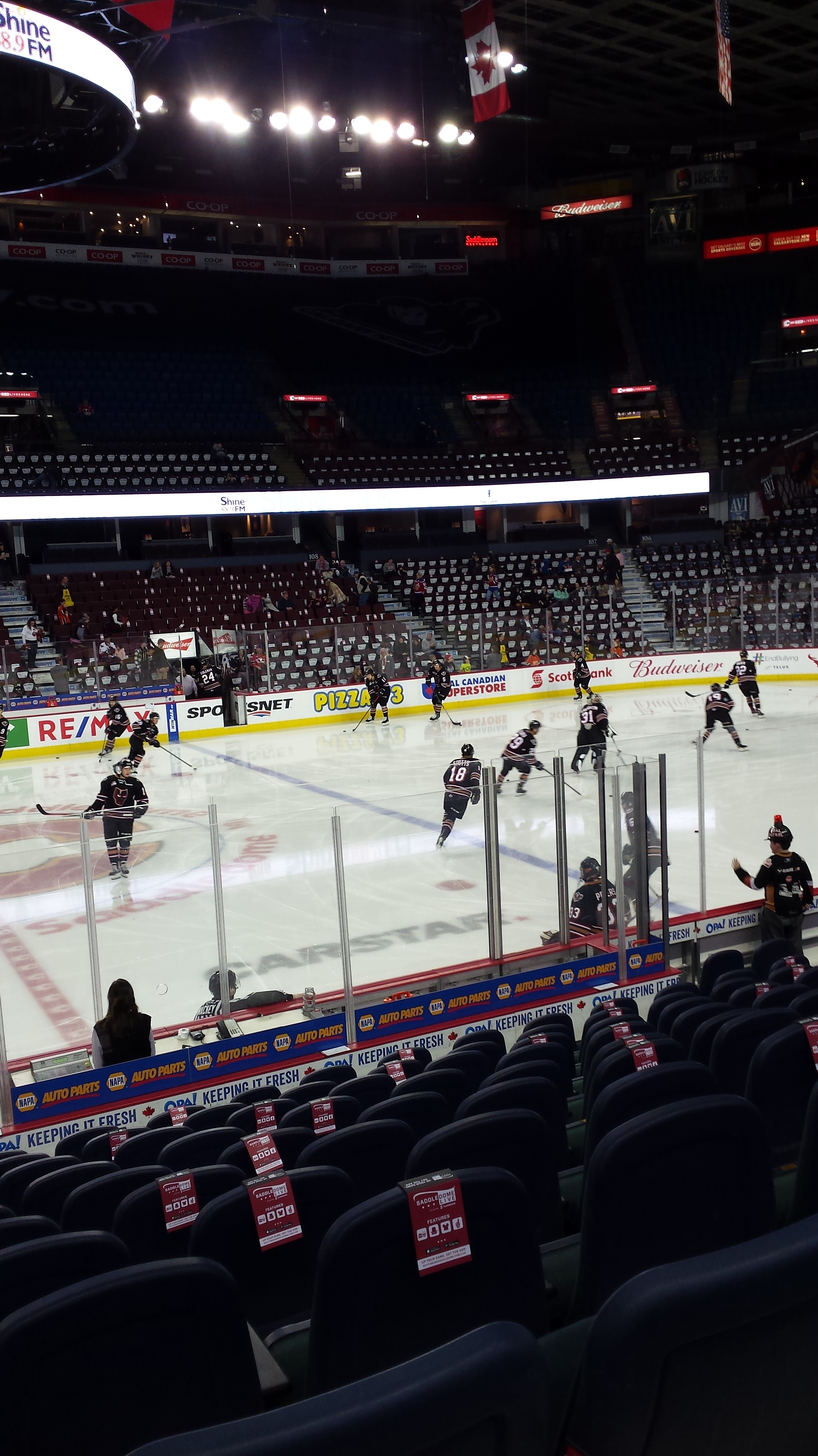 During warm up Jackson stood by the boards in his new Hitman toque and lo and behold a player actually shot a puck over the glass for him. There were a lot of boys that didn’t get as lucky. He was very happy. Later his hands and face were totally black from the puck. Spit and a napkin helped a bit. 12 rows up at centre line are perfect seats. Only issue is they are in the centre of the row so bathroom breaks are difficult. But the seat delivery is awesome. Beer, hot dogs etc delivered right to you. Same price except with a built in 19% gratuity fee. Very convenient though.
