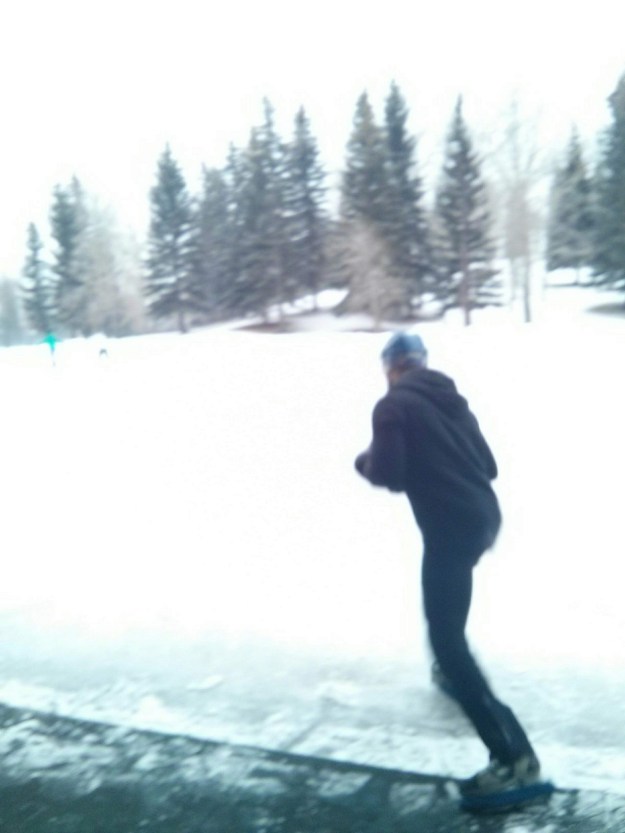 This picture is of Corey 5 seconds before a FAIL. Corey is a fantastic skater and played hockey so has much better skating skills than most people. Notice the forgotten blade guards on. He hits the ice and expects to fly but instead nose dived to the ice. Funny for us. Not so much for Corey. LOL