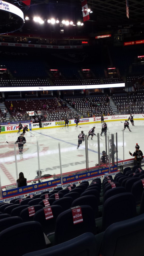 Friends of Victoria’s gave them two tickets to the Hitman game tonight. Tor had a function to go to and Cor wasn’t feeling the best so Jackson and I headed out in the snow to the game. Just some comments. First just because of a little snow doesn’t mean you have to stay at home. The streets were empty. The parking lot at the arena was empty and the seats were empty as you can see by the pictures. Shame, as this was my first WHL game and I was impressed. This is every bit as good as hockey as the NHL. Fast and wonderful skaters. Fights and extra effort by all of the players. They were playing the Edmonton Oil Kings. I don’t know what is wrong with Edmonton. Remember they screwed up the Oiler uniform especially with that bolt jersey, well the Oil Kings did the same. The new logo and colors you wouldn’t even recognize it as Edmonton.