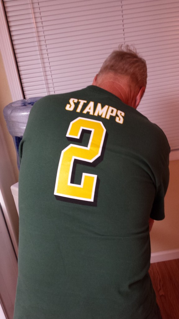 Here is late picture. We all know the Stamps won. Fred watched the games with me. Being from Edmonton he wore his Eskimo jersey each game. I then discover he is a closet Stamps fan !