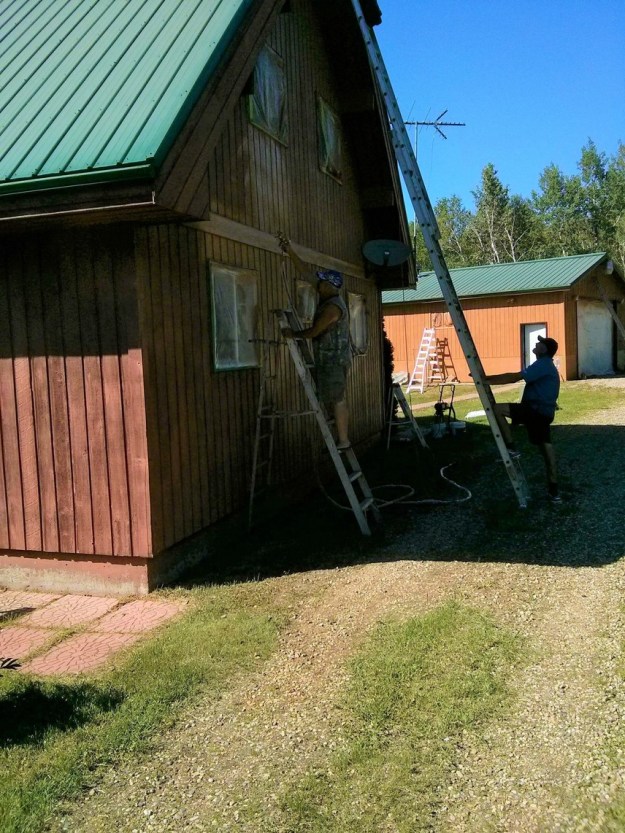I had previously rented a paint sprayer from Home Depot and had wonderful success with it and knew what it could do. First thing in the a.m. I headed to Spruce Grove to pick one up. To have the proper equipment is essential, absolutely needed to do good work and lighten the workload. While in Spruce Grove with the absorption rate we knew we would need more stain and Rona carries the brand. That Spruce Grove Rona should be closed immediately as it is a joke. Empty shelves. They missed out on a $600 paint sale as Jackie drove into Edmonton to pick up some from Lowe’s.