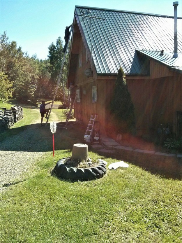 Fred showed up early and we started on the HIGH side. I do not know exactly how high but it is for sure well over 30 ft up in the air. To try to help reach the peak we used Alfred’s trailer and screwed cleats on it and placed the ladder on the deck to gain height. Alfred spent a lot of time a way way way up there. Another successful day.