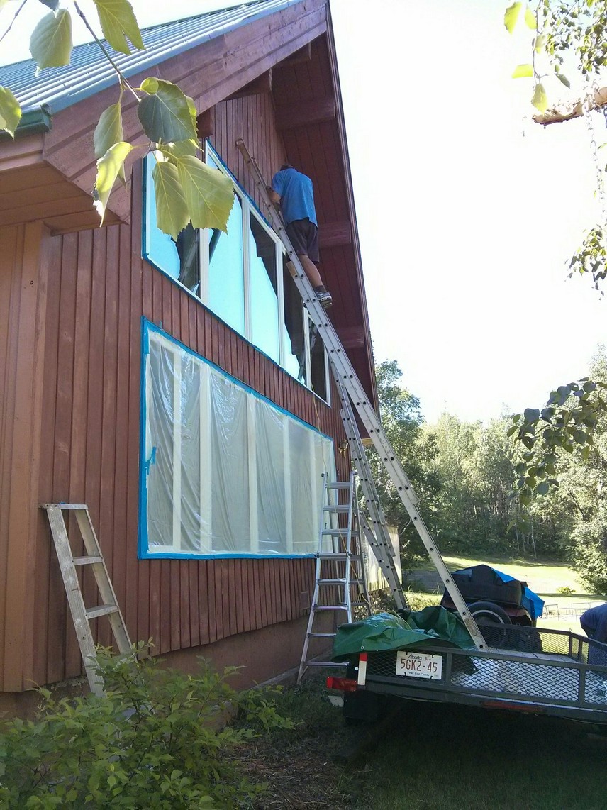 Next day rise again and started right away. Jackie left for home as Alfred and I started to remove more plastic from the windows. Removed it all including the garage. Fixed up a few over sprays on the house and garage. Caulked all of the lower windows. The uppers are high and with the cedar having the square channels extremely difficult to caulk and look great. Most of them were still in good shape. If Alfred wants in the near future with a ladder only a few uppers to be done. We then reinstalled all of the downspouts. Cleaned up a few things, moved a few things, hung up some ladders and I was done.