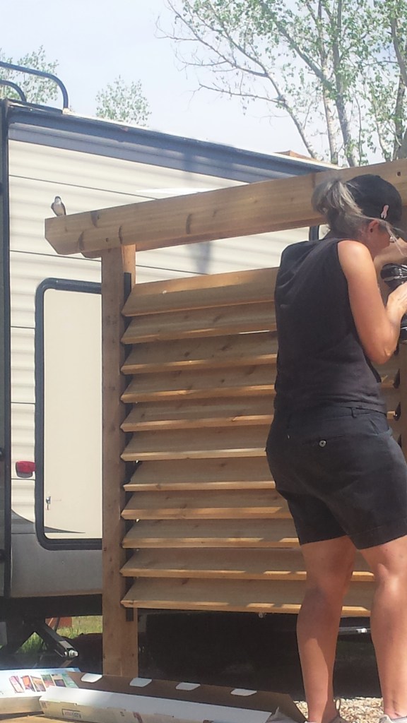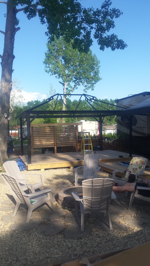 Right on que the truck showed up at our lot. A full van semi. The driver was excellent except for his size. 5 ft 5 and slight with a bad leg. One box was 210 pounds the other 175 pounds. He had a lift on the truck which helped big time but moving the boxes was heavy. HEAVY. Jackie was visiting her Dad and doing some errands in the morning so i started to assemble and sort. First let me say 1000 screws is a pain. Funny thing when the boxes arrived my assumption combined with their marketing lead me to believe it was made in Quebec. Wrong CHINA. Everything went well. I assembled and screwed and screwed. After starting with their Allen wrench which didn’t last long i switched to my drill turned a way down and adjusted to work perfect. I leaned posts onto the motor home and the large tree. I was able to assemble the entire base assembly. Jackie then arrived and helped me. She was fantastic and worked with me for the rest of the day. We worked for about 6 hours. I was happy with both the quality and the amount we got done. Other than a ankle turning mishap by Jackie she was a great assembler.