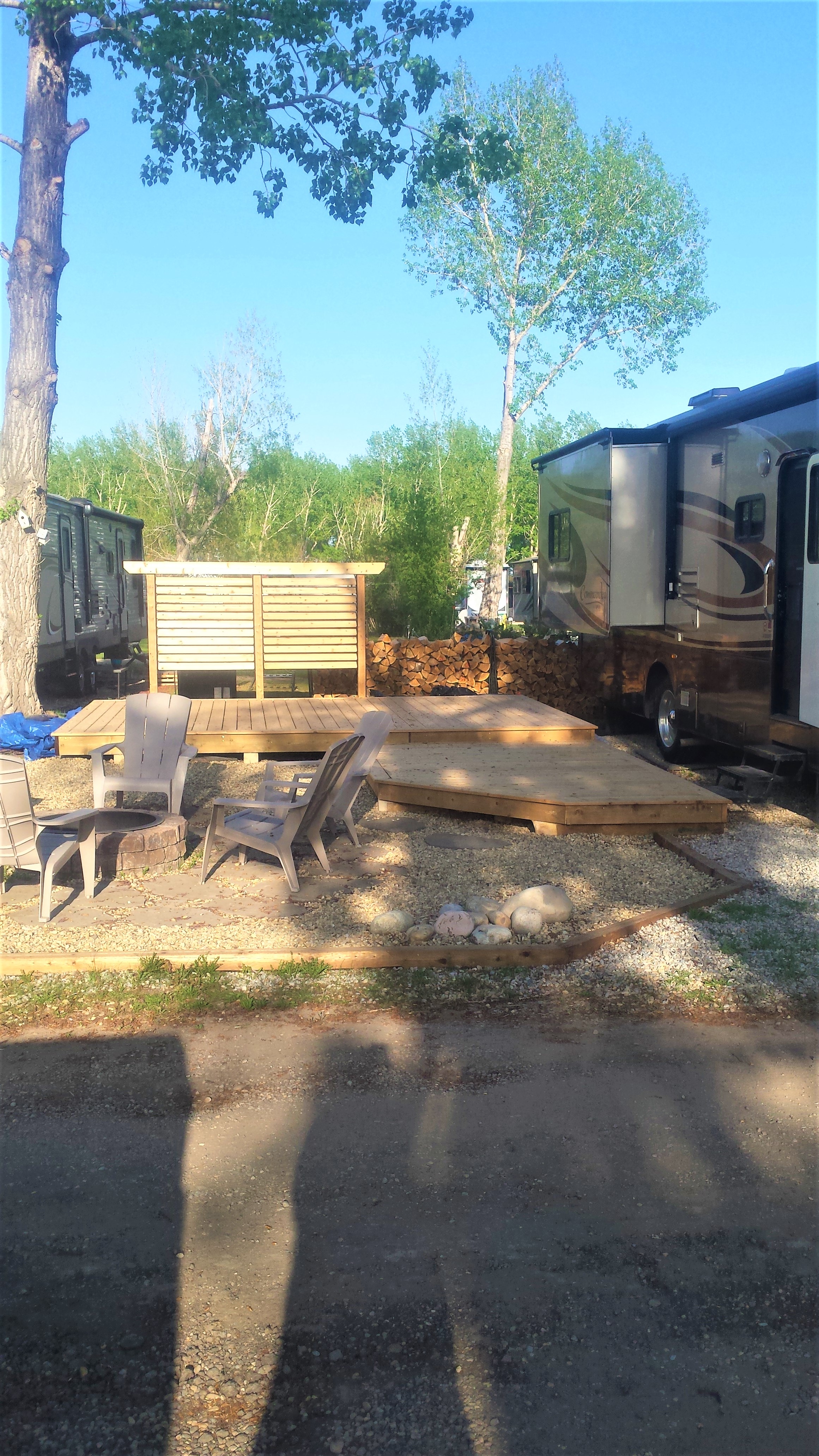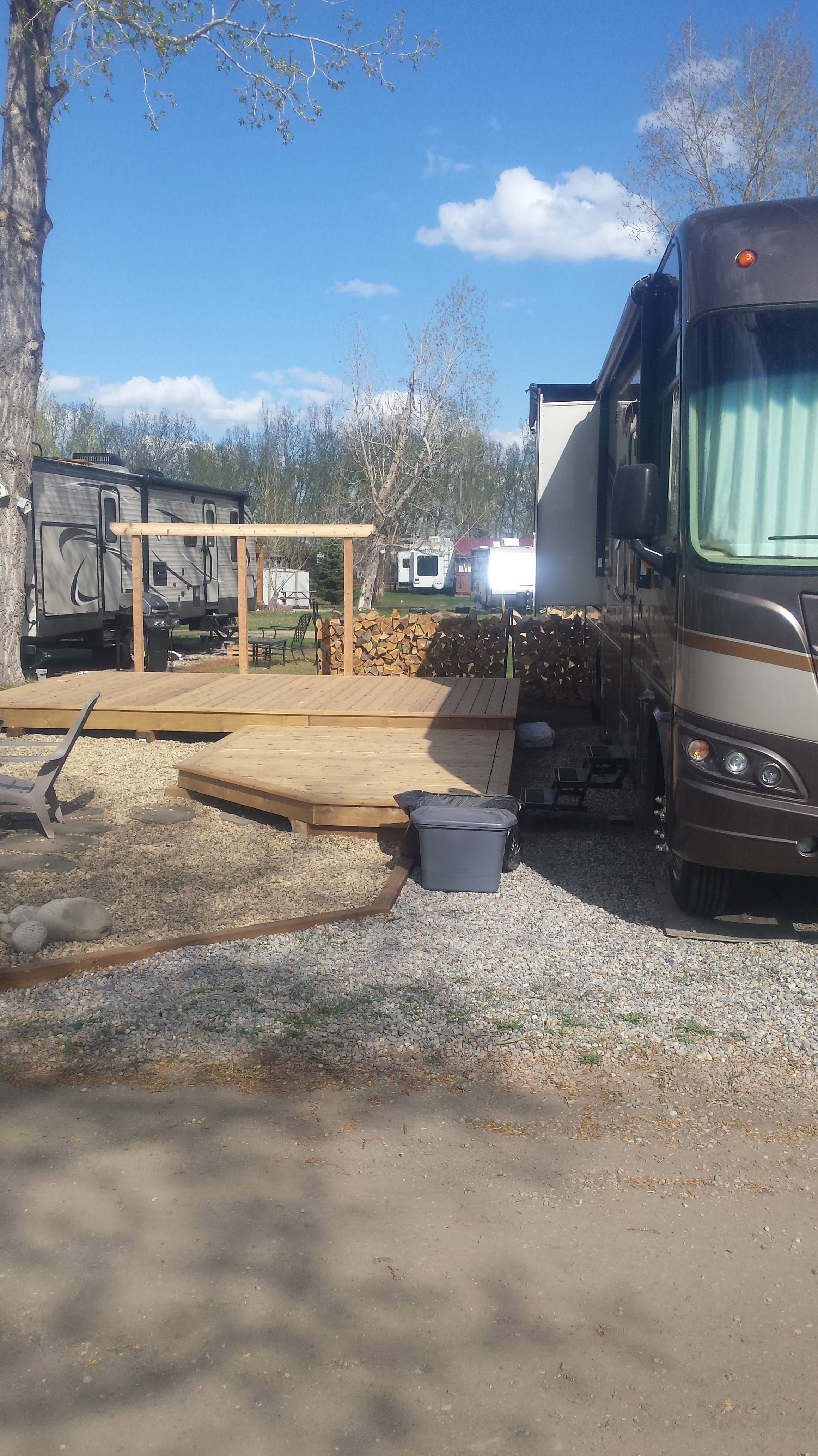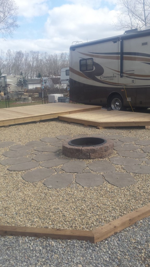 2 straight weeks of manual labor is wearing on me. But i jumped out of bed early and headed to the lot. I screwed each board down as when making it I didn’t know the quantity of screws I had (special stainless steel torex ) so I screwed every other joist. I made the deck 12 inch on centres as i wanted no bounce or deflection in the 5/4 boards. Takes a while. Screwed down the picture frame board all the way around. Moved the motor home to it’s proper location which works out well for getting out and stepping on the deck. Hooked up the water and cleared all of the anti- freeze out of the lines. Took a while and made sure every line was clear. Filled the tank and will add the bleach next day or so and refill a couple of times and then will be good to go.