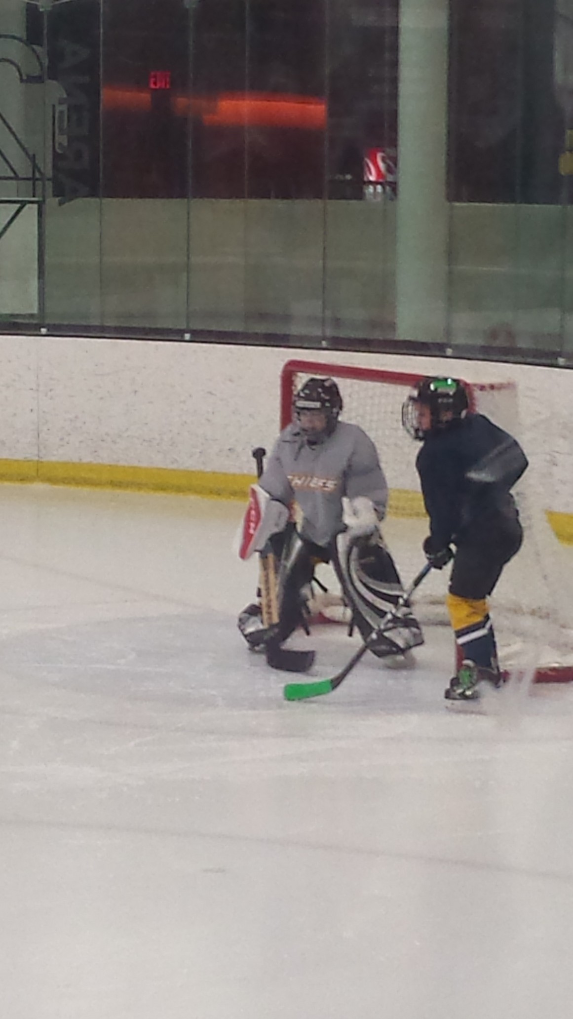 I picked up Jackson and we headed to the rink for hockey practice. Today he was practicing as a goalie for his game on Saturday. He did very well. He doesn’t flinch when a puck is sent directly at him at all. With a little more practice he could be good but I would prefer him to be a forward. Lots more fun to score than being scored on. Putting on all of that equipment was fun trying to figure out where each buckle goes and the order of dressing. We did awesome and I installed only one stretch cord at the bottom in the wrong place. Another guy showed me where it was supposed to wrap around the toe of the skate. Overall the system is quite good. It was a fun practice to watch.
