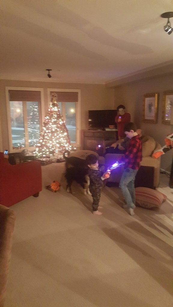 Well here is hoping everyone had a wonderful Christmas. I believe most people would say it is a tiring time. Not only the extra hours awake, but the stress of gift buying, entertaining , cooking, travelling etc wears on people. I have to say Jackie & I had a wonderful Christmas. No travel this year which is nice as the girls and kids came to our place. We had a Full house. We had Jessica, Penny, Atticus, August, Victoria, Corey, Jackson, with Hazel, Olive and Kate staying overnight. With the Murphy bed, plus air mattress and foamy on the floor everyone had a place to sleep in relatively comfort but it is away and different from being home. It is much appreciated the entire family was able to be together. A person when faced with the chaos just has to relax and enjoy the noise. The kids were amazing. They tried and were quite successful in staying awake late into the evening. Overall very well behaved. It is a little stressful being a parent with kids at another person’s home. We played boards games, we had numerous laser tag gun fights and a way too many treats. Jackie made cookies with the boys for Santa to put out. The dogs all were very good. A little hairy LOL but that never killed anyone. We all got to bed just before midnight on Christmas eve. The outside temperature was perfect for a fridge as the beer stayed cold on the patio as the fridge was full.