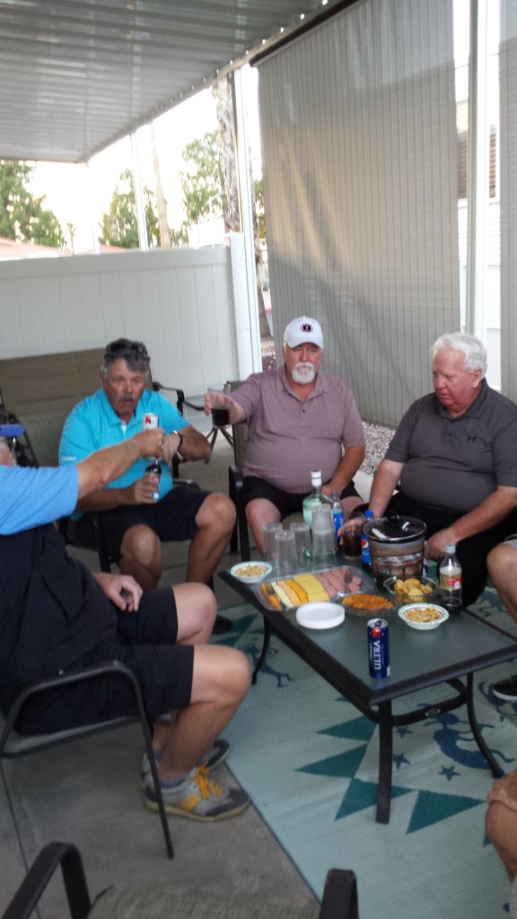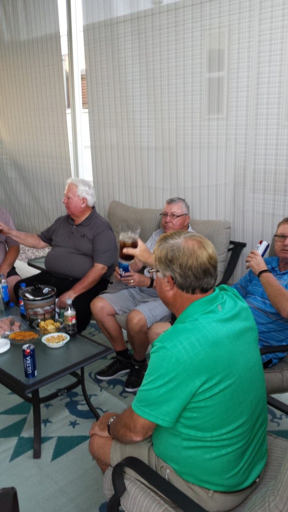 We had the after golf get together at Mike’s place. I didn’t realize it but Mike bought the home that Keith & Jenny looked at last time they were here. Nice home with a back wall instead of a neighbor which makes it private and secluded. The gathering of guys sure was diversified tonight. There were gentleman that owned a private ambulance company, car dealership, trucking company, service station/carwash, lumberyard, Air Canada Mgr to name a few. All fun nice guys. Being retired is awesome as everyone is just in a better mood and all about having fun.