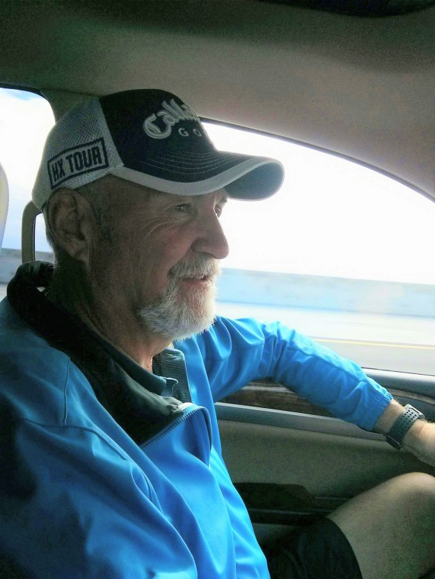Driving to golf. I think Jackie is trying to determine if my ears and nose are getting bigger as she has taken a similar picture numerous times over the years and is trying to compare them. LOL