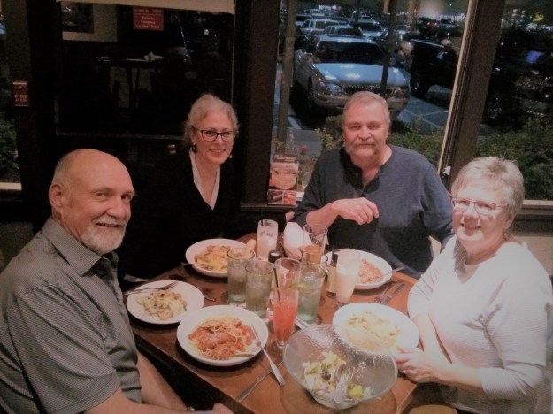 Fred & Terry picked us up and we headed to Olive Garden. I love the Olive’s salad and bread sticks and their food is always good. I used the wait list system they have and it worked fantastic as we where rushed right by tons of people waiting at the front check in. Our server was superb. They can make a meal special. He even arranged for someone to whip out and pick up Clam juice and made me a Canadian Caeser. Awesome. Full, full we left after having a great meal.