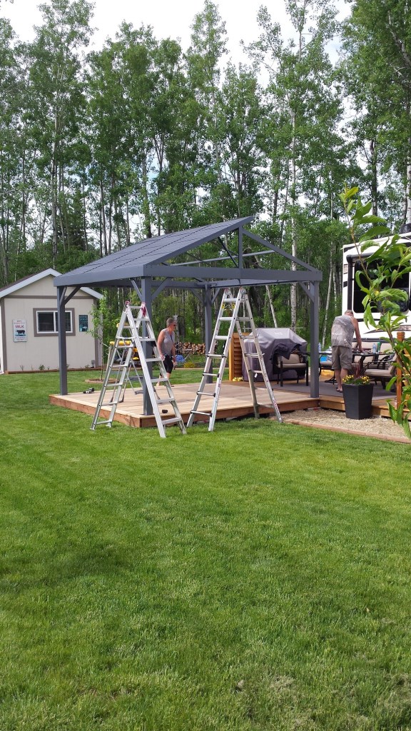 Second day up early and started and worked until about 6 pm. Then tiredness crept in. But we completely finished the deck and 75 % of the gazebo. They bought a modern design one 12 x 12 and I love it. Gives it a unique look and design. As usual there are 1000 bolts to put in with a Alan wrench. We broke the rules and used our drills clutched a way down. We both have Sojaq gazebos and the reviews are always excellent on them. I love mine but it has a few tweaks the manufacturer could have done as does this one. The roof panels don’t lock they just overlap which is fine except for aesthetics. The only real issue was the extremely poor instructions. No words just pictures and poorly done. Three bars we put up and then took down and re installed due to poor instructions. If Fred & I struggle comprehending the process for install I can only imagine a newbie to construction. We worked all day again and quit at supper as we were tired. Another good day !